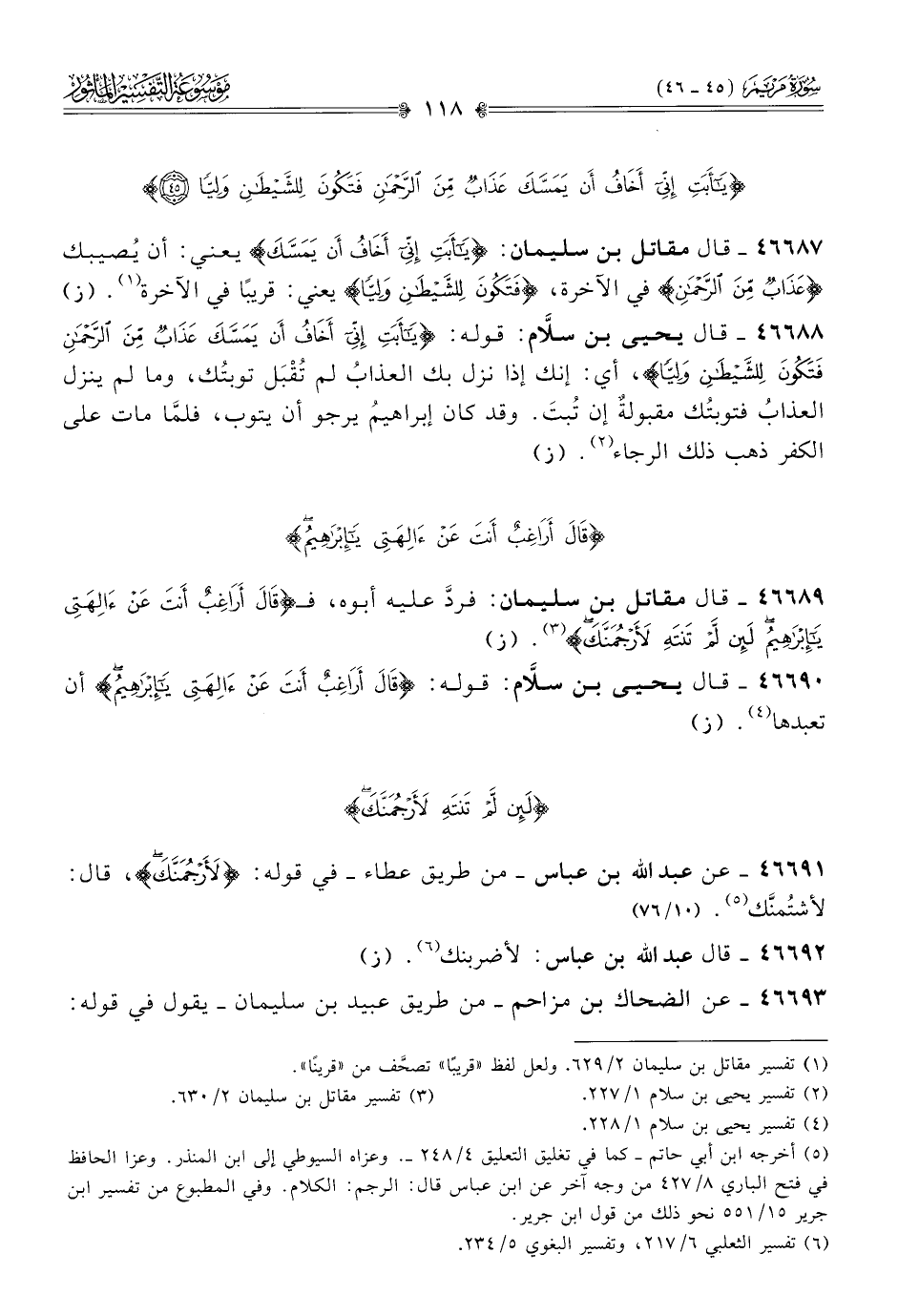 ٤٦٦٨٨ - قال يحيى بن سلّام: قوله: {يا أبت إني أخاف أن يمسك عذاب من الرحمن فتكون للشيطان وليا}، أي: إنك إذا نزل بك العذابُ لم تُقْبَل توبتُك، وما لم ينزل العذابُ فتوبتُك مقبولةٌ إن تُبتَ. وقد كان إبراهيمُ يرجو أن يتوب، فلمّا مات على الكفر ذهب ذلك الرجاء (¬٢). (ز)