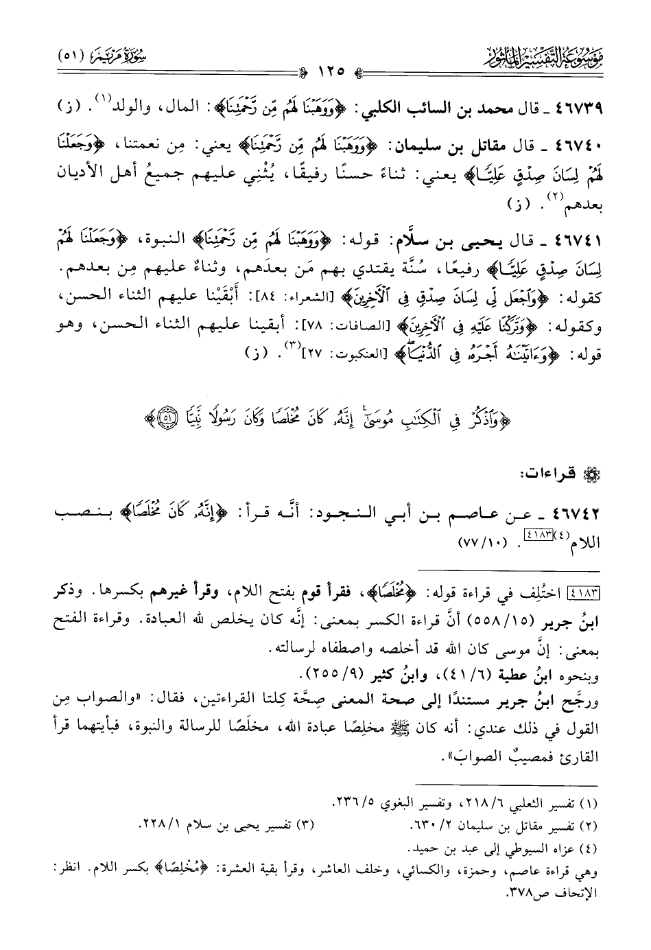 [٤١٨٣] اختُلِف في قراءة قوله: {مخلصا}، فقرأ قوم بفتح اللام، وقرأ غيرهم بكسرها. وذكر ابنُ جرير (١٥/ ٥٥٨) أنّ قراءة الكسر بمعنى: إنّه كان يخلص لله العبادة. وقراءة الفتح بمعنى: إنّ موسى كان الله قد أخلصه واصطفاه لرسالته.