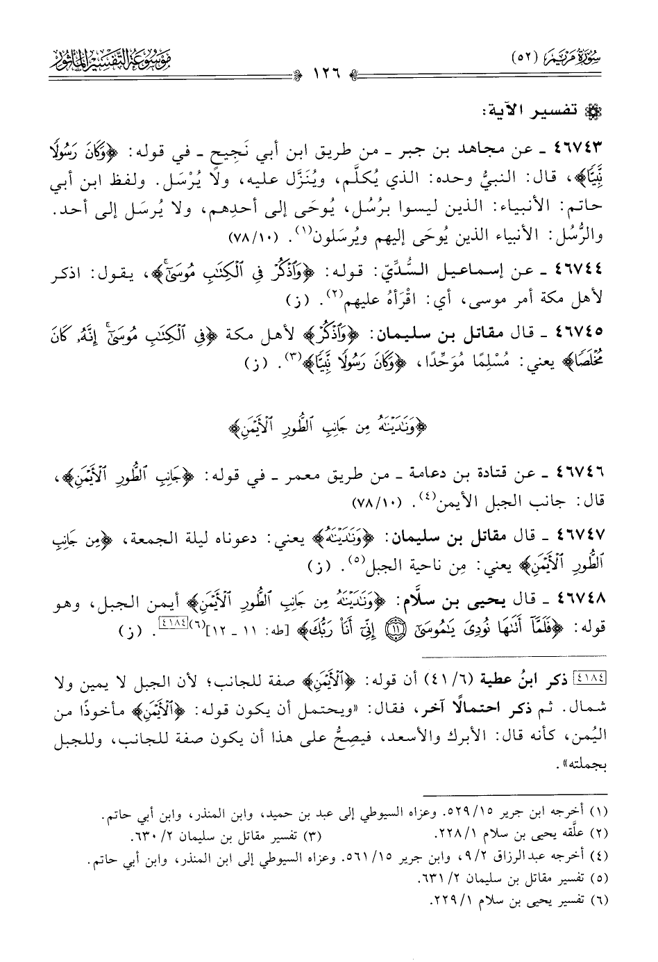 ٤٦٧٤٨ - قال يحيى بن سلّام: {وناديناه من جانب الطور الأيمن} أيمن الجبل، وهو قوله: {فلما أتاها نودي يا موسى (١١) إني أنا ربك} [طه: ١١ - ١٢] (¬٦) [٤١٨٤]. (ز)