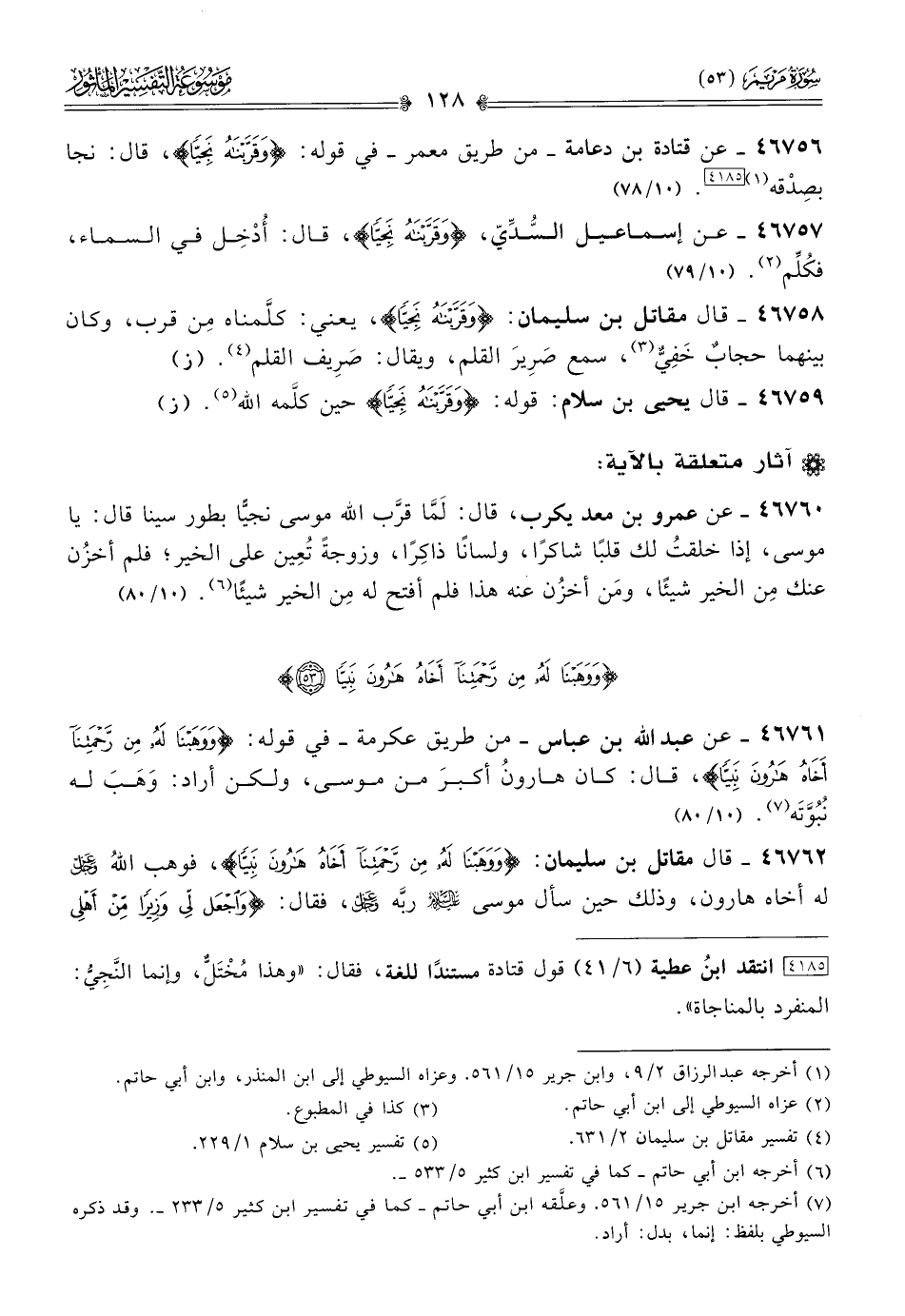 ٤٦٧٥٦ - عن قتادة بن دعامة -من طريق معمر- في قوله: {وقربناه نجيا}، قال: نجا بصِدْقه (¬١) [٤١٨٥]. (١٠/ ٧٨)