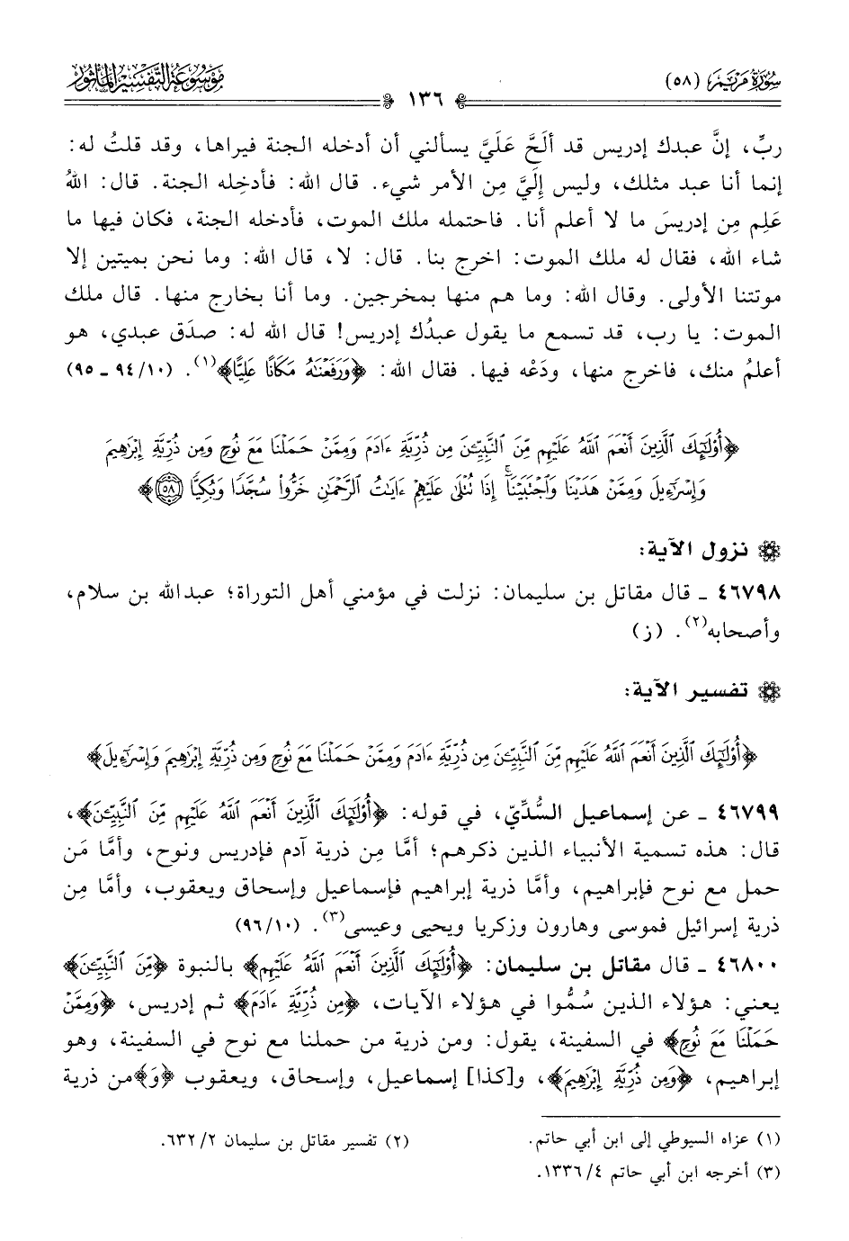 ٤٦٧٩٩ - عن إسماعيل السُّدِّيّ، في قوله: {أولئك الذين أنعم الله عليهم من النبيين}، قال: هذه تسمية الأنبياء الذين ذكرهم؛ أمّا مِن ذرية آدم فإدريس ونوح، وأمّا مَن حمل مع نوح فإبراهيم، وأمّا ذرية إبراهيم فإسماعيل وإسحاق ويعقوب، وأمّا مِن ذرية إسرائيل فموسى هارون وزكريا ويحيى وعيسى (¬٣). (١٠/ ٩٦)