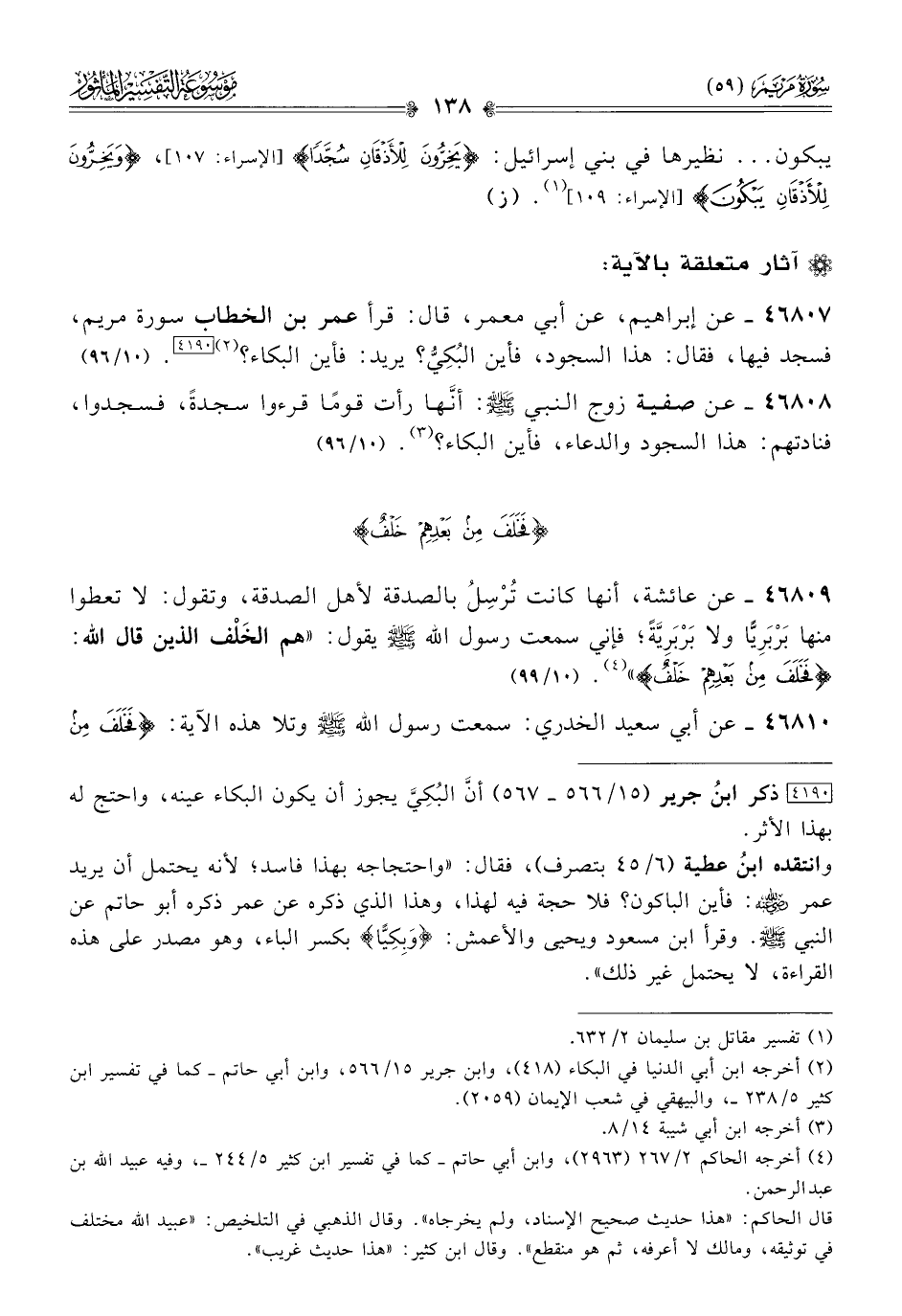 ٤٦٨٠٧ - عن إبراهيم، عن أبي معمر، قال: قرأ عمر بن الخطاب سورة مريم، فسجد فيها، فقال: هذا السجود، فأين البُكِيُّ؟ يريد: فأين البكاء؟ (¬٢) [٤١٩٠]. (١٠/ ٩٦)