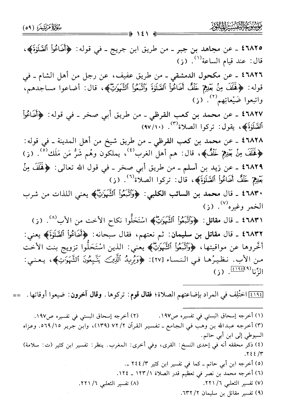 ٤٦٨٣٢ - قال مقاتل بن سليمان: ثم نعتهم، فقال سبحانه: {أضاعوا الصلاة} يعني: أخَّروها عن مواقيتها، {واتبعوا الشهوات} يعني: الذين اسْتَحَلُّوا تزويج بنت الأخت من الأب. نظيرُها في النساء [٢٧]: {ويريد الذين يتبعون الشهوات}، يعني: الزِّنا (¬٩) [٤١٩٤]. (ز)