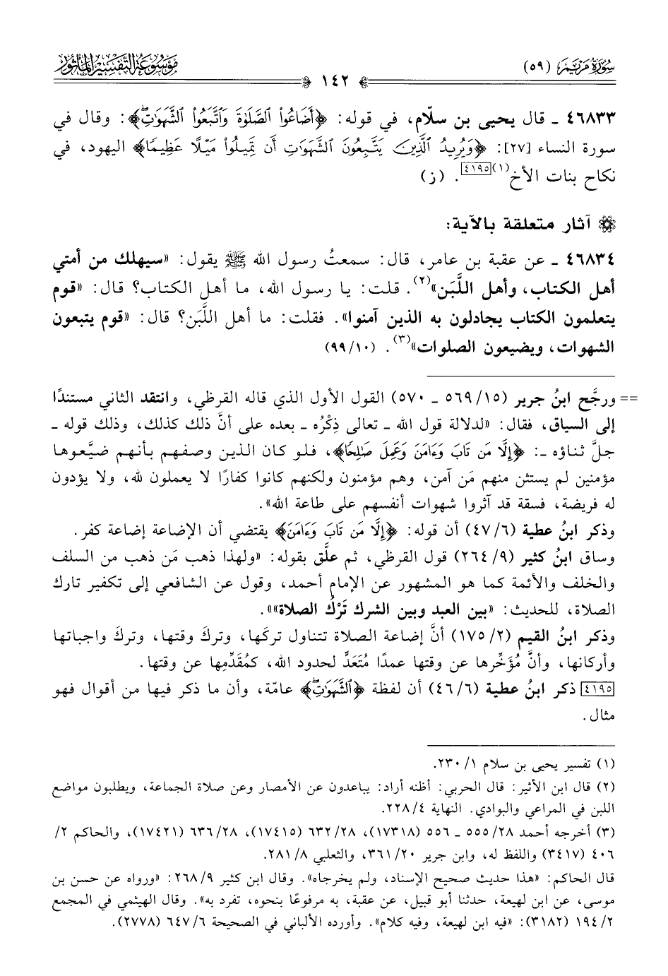 ٤٦٨٣٣ - قال يحيى بن سلّام، في قوله: {أضاعوا الصلاة واتبعوا الشهوات}: وقال في سورة النساء [٢٧]: {ويريد الذين يتبعون الشهوات أن تميلوا ميلا عظيما} اليهود، في نكاح بنات الأخ (¬١) [٤١٩٥]. (ز)