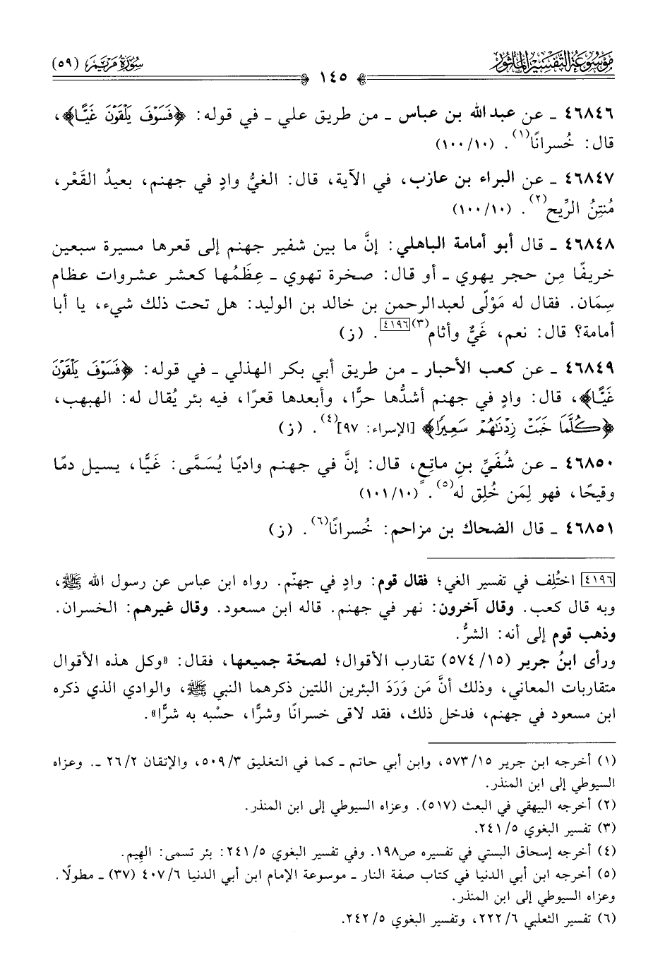 [٤١٩٦] اختُلِف في تفسير الغي؛ فقال قوم: وادٍ في جهنّم. رواه ابن عباس عن رسول الله - صلى الله عليه وسلم -، وبه قال كعب. وقال آخرون: نهر في جهنم. قاله ابن مسعود. وقال غيرهم: الخسران. وذهب قوم إلى أنه: الشرُّ.