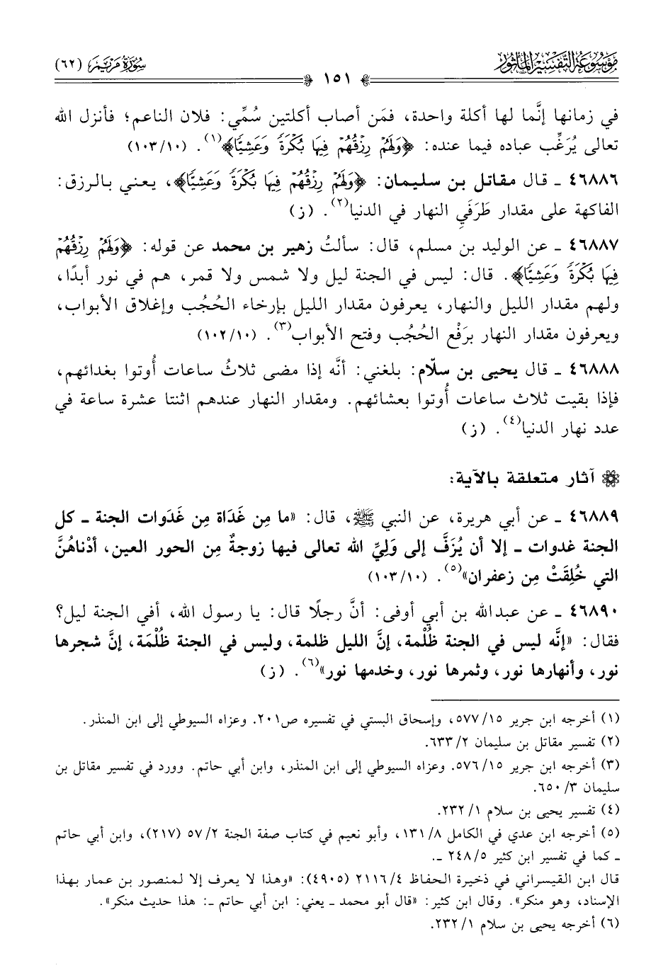 ٤٦٨٨٧ - عن الوليد بن مسلم، قال: سألتُ زهير بن محمد عن قوله: {ولهم رزقهم فيها بكرة وعشيا}. قال: ليس في الجنة ليل ولا شمس ولا قمر، هم في نور أبدًا، ولهم مقدار الليل والنهار، يعرفون مقدار الليل بإرخاء الحُجُب وإغلاق الأبواب، ويعرفون مقدار النهار برَفْع الحُجُب وفتح الأبواب (¬٣). (١٠/ ١٠٢)