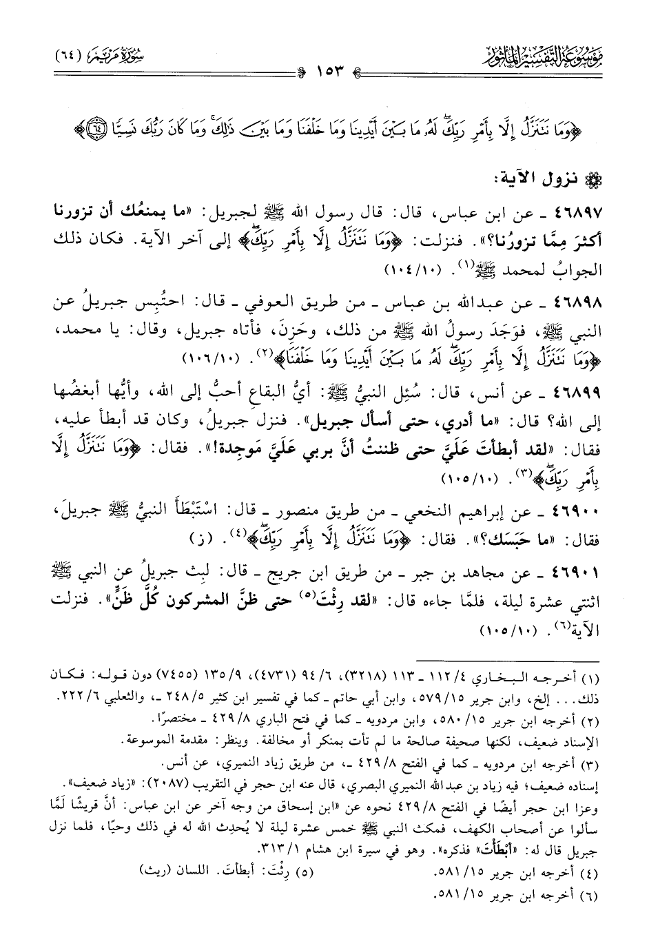 ٤٦٨٩٧ - عن ابن عباس، قال: قال رسول الله - صلى الله عليه وسلم - لجبريل: «ما يمنعُك أن تزورنا أكثرَ مِمّا تزورُنا؟». فنزلت: {وما نتنزل إلا بأمر ربك} إلى آخر الآية. فكان ذلك الجوابُ لمحمد - صلى الله عليه وسلم - (¬١). (١٠/ ١٠٤)