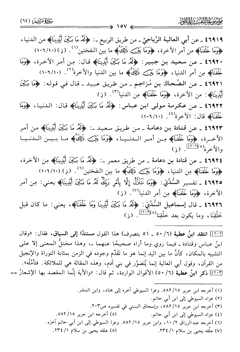 [٤٢٠٢] انتقد ابنُ عطية (٦/ ٥٠ - ٥١ بتصرف) هذا القول مستندًا إلى السياق، فقال: «وقال ابنُ عباس وقتادة -فيما روي وما أراه صحيحًا عنهما-، وهذا مختلُّ المعنى إلا على التشبيه بالمكان، كأنّ ما بين اليد إنما هو ما تَقَدَّم وجوده في الزمن بمثابة التوراة والإنجيل من القرآن، وقول أبي العالية إنما يُتَصَوَّر في بني آدم، وهذه المقالة هي للملائكة. فتأمَّلْه».