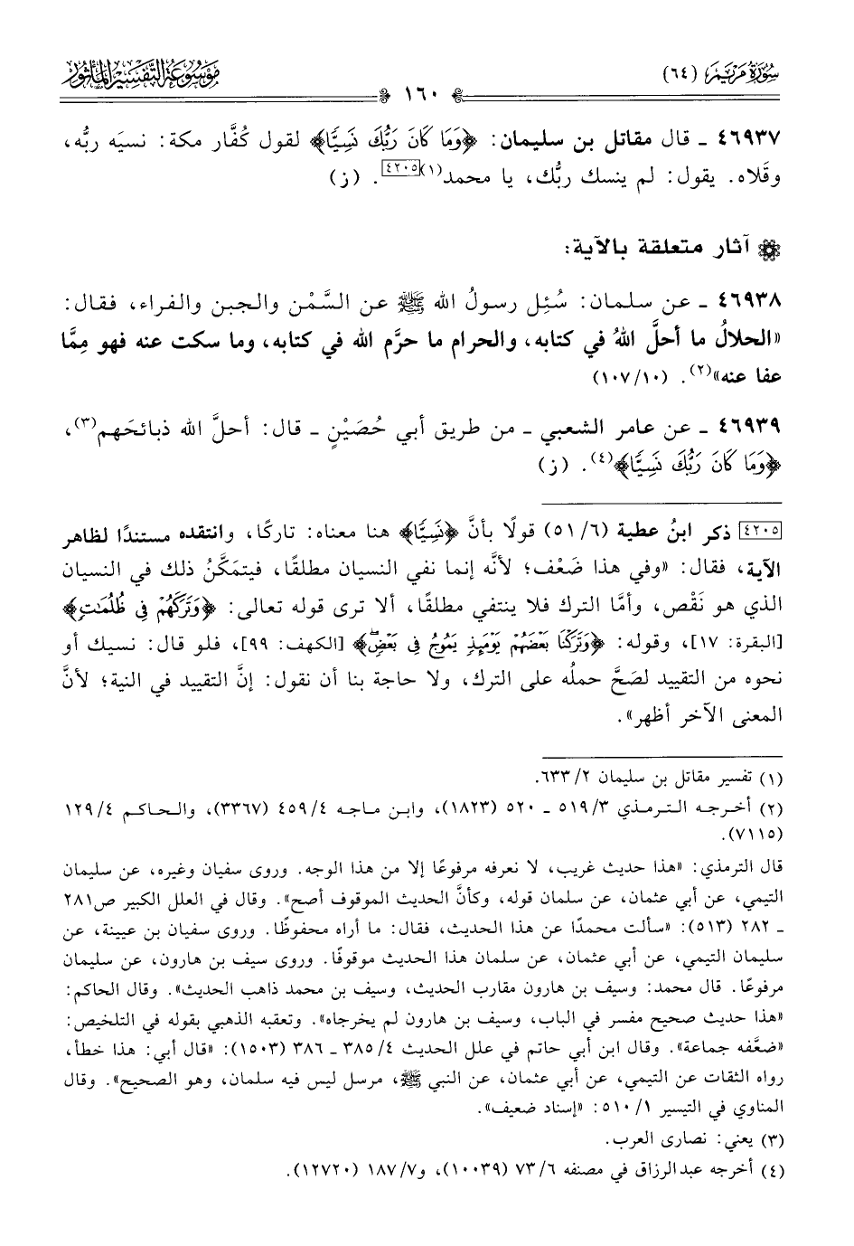 ٤٦٩٣٩ - عن عامر الشعبي -من طريق أبي حُصَيْنٍ- قال: أحلَّ الله ذبائحَهم (¬٣)، {وما كان ربك نسيا} (¬٤). (ز)