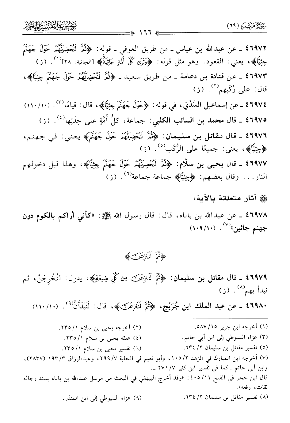 ٤٦٩٧٦ - قال مقاتل بن سليمان: {ثم لنحضرنهم حول جهنم} يعني: في جهنم، {جثيا}، يعني: جميعًا على الرُّكَب (¬٥). (ز)