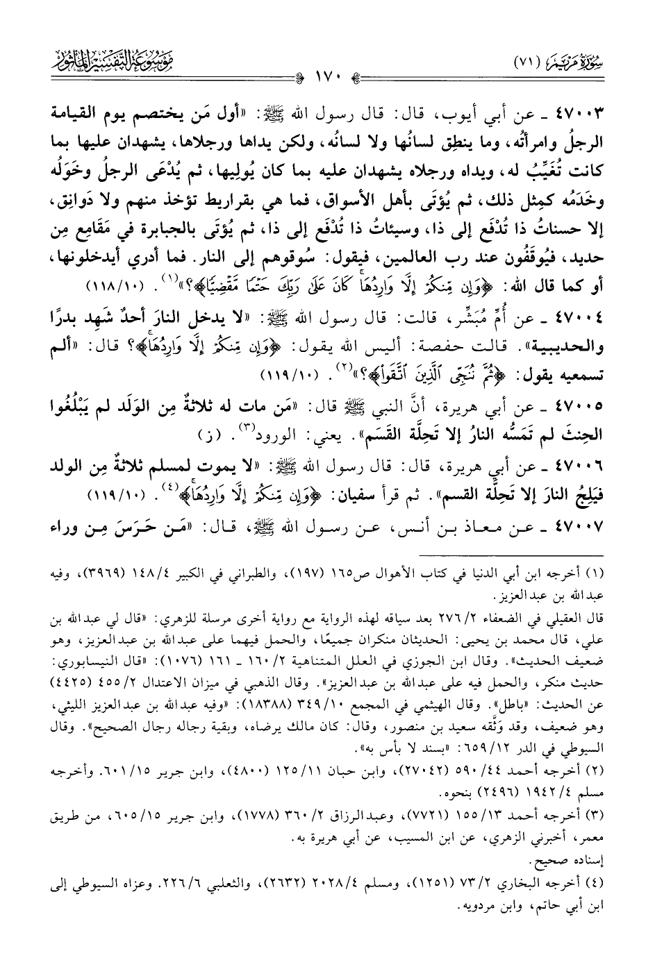 ٤٧٠٠٥ - عن أبي هريرة، أنّ النبي - صلى الله عليه وسلم - قال: «مَن مات له ثلاثةٌ مِن الوَلَد لم يَبْلُغُوا الحِنثَ لم تَمَسُّه النارُ إلا تَحِلَّة القَسَم». يعني: الورود (¬٣). (ز)
