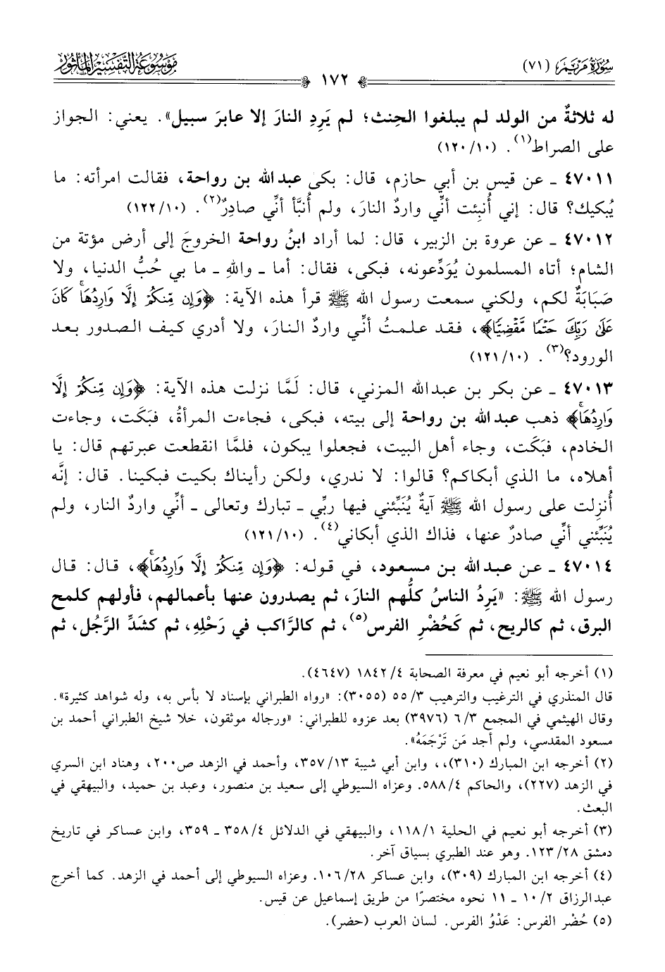 ٤٧٠١٢ - عن عروة بن الزبير، قال: لما أراد ابنُ رواحة الخروجَ إلى أرض مؤتة من الشام؛ أتاه المسلمون يُوَدِّعونه، فبكى، فقال: أما -واللهِ- ما بي حُبُّ الدنيا، ولا صَبابَةٌ لكم، ولكني سمعت رسول الله - صلى الله عليه وسلم - قرأ هذه الآية: {وإن منكم إلا واردها كان على ربك حتما مقضيا}، فقد علمتُ أنِّي واردٌ النارَ، ولا أدري كيف الصدور بعد الورود؟ (¬٣). (١٠/ ١٢١)