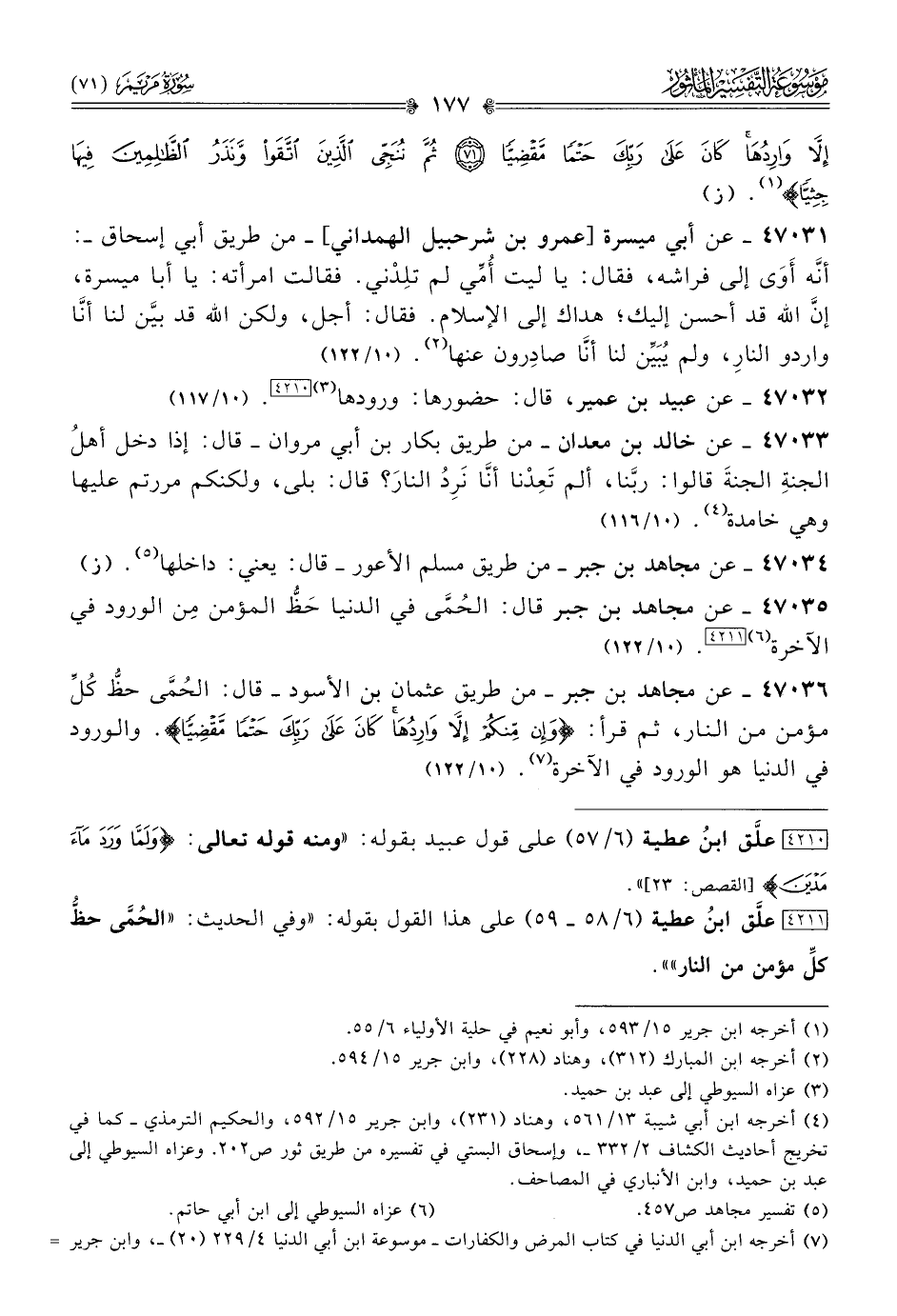 ٤٧٠٣٦ - عن مجاهد بن جبر -من طريق عثمان بن الأسود- قال: الحُمّى حظُّ كُلِّ مؤمن من النار، ثم قرأ: {وإن منكم إلا واردها كان على ربك حتما مقضيا}. والورود في الدنيا هو الورود في الآخرة (¬٧). (١٠/ ١٢٢)