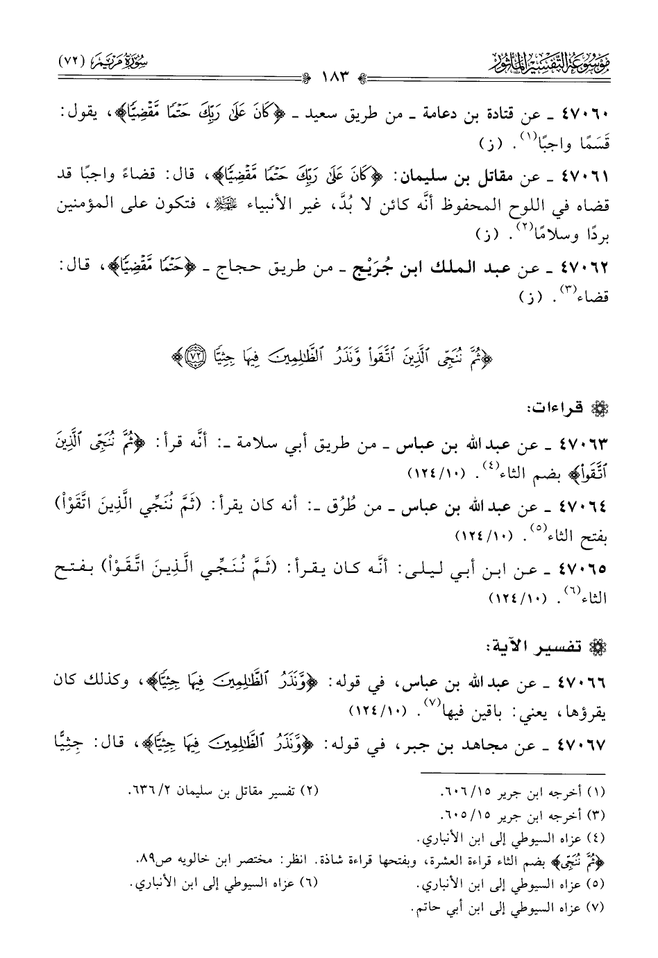 ٤٧٠٦٤ - عن عبد الله بن عباس -من طُرُق- أنه كان يقرأ: (ثَمَّ نُنَجِّي الَّذِينَ اتَّقَوْاْ) بفتح الثاء (¬٥). (١٠/ ١٢٤)