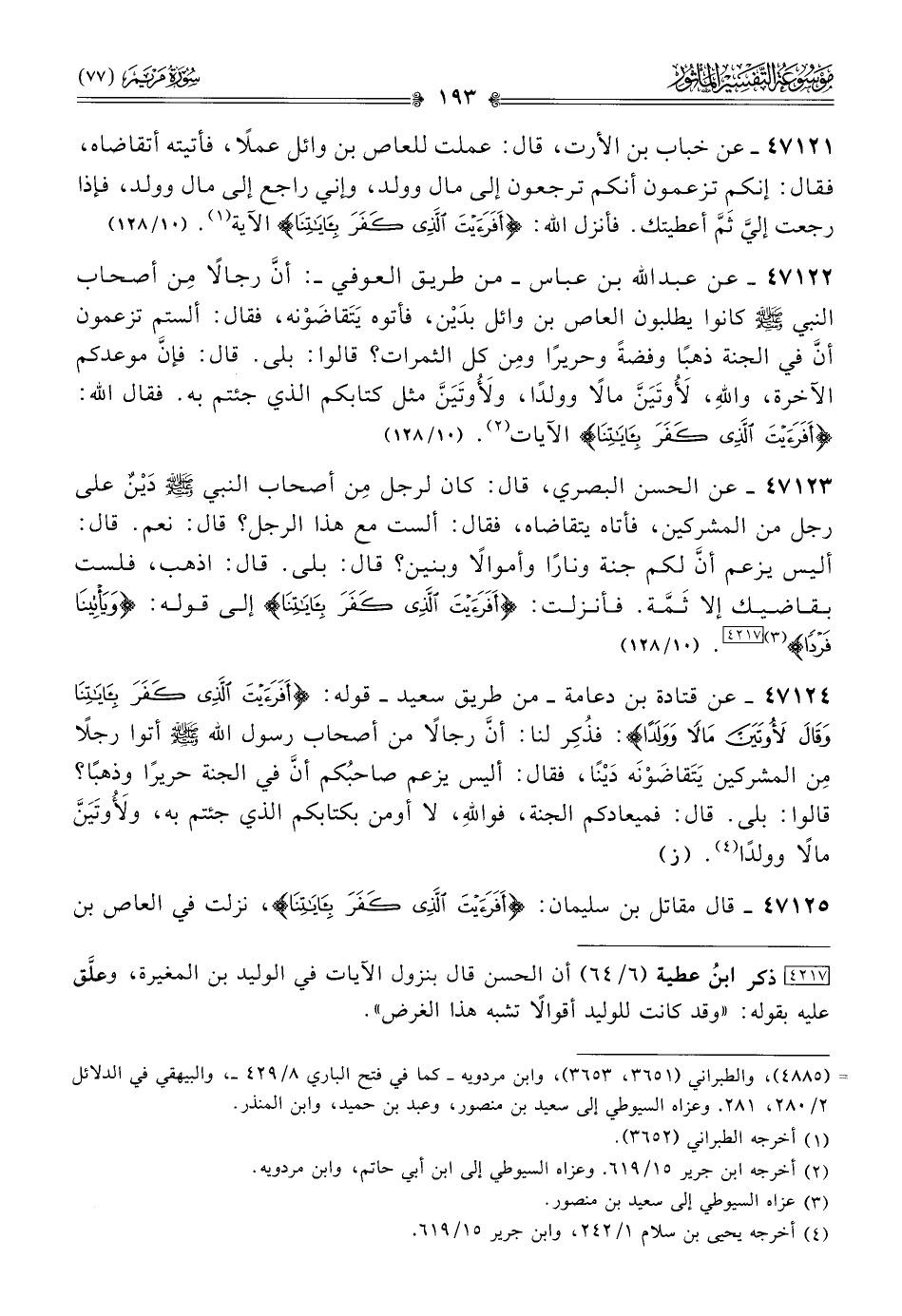 ٤٧١٢٢ - عن عبد الله بن عباس -من طريق العوفي-: أنّ رجالًا مِن أصحاب النبي - صلى الله عليه وسلم - كانوا يطلبون العاص بن وائل بدَيْن، فأتوه يَتَقاضَوْنه، فقال: ألستم تزعمون أنّ في الجنة ذهبًا وفضةً وحريرًا ومِن كل الثمرات؟ قالوا: بلى. قال: فإنّ موعدكم الآخرة، واللهِ، لَأُوتَيَنَّ مالًا وولدًا، ولَأُوتَيَنَّ مثل كتابكم الذي جئتم به. فقال الله: {أفرأيت الذي كفر بأياتنا} الآيات (¬٢). (١٠/ ١٢٨)