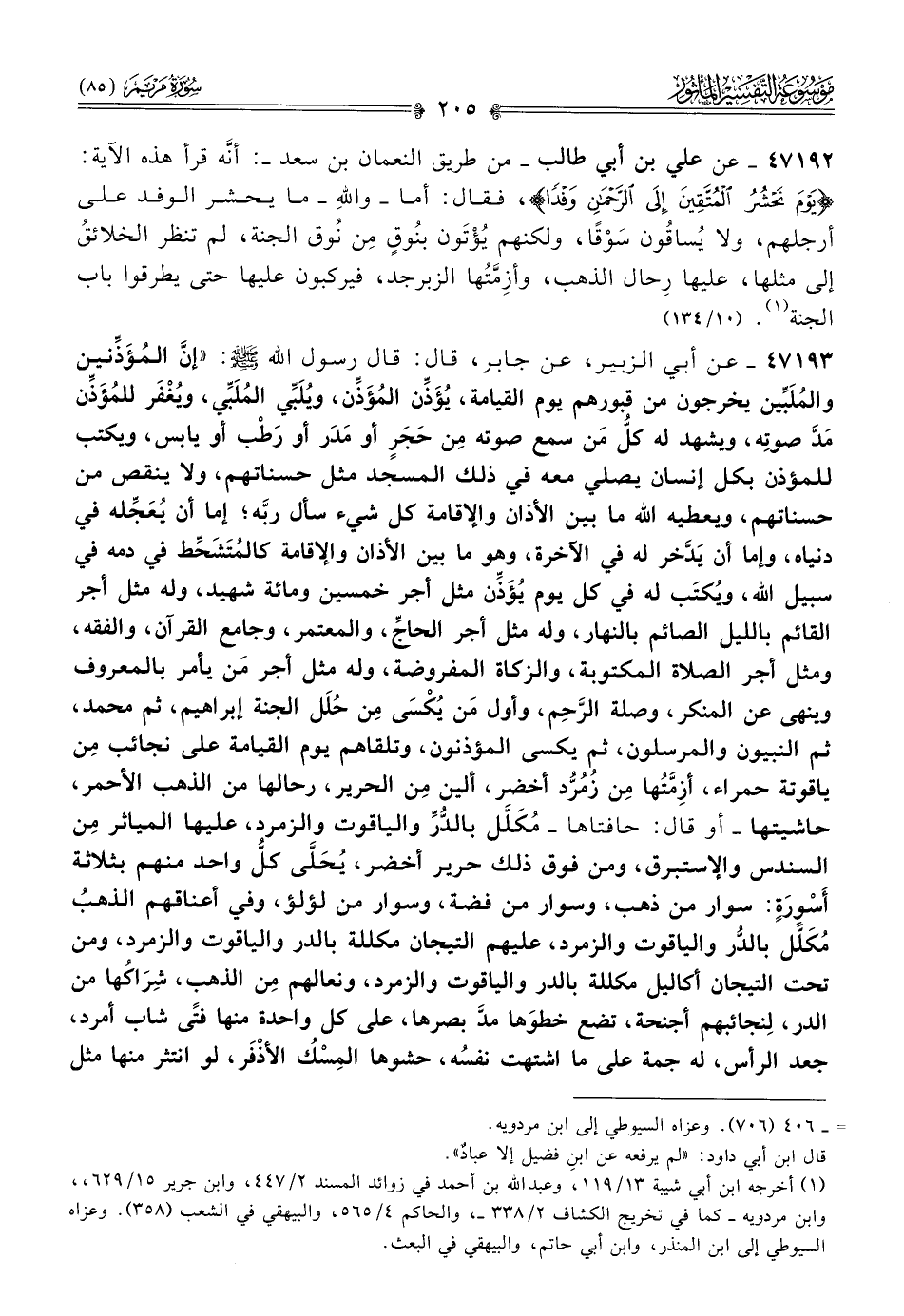 ٤٧١٩٣ - عن أبي الزبير، عن جابر، قال: قال رسول الله - صلى الله عليه وسلم -: «إنّ المُؤَذِّنين والمُلَبِّين يخرجون من قبورهم يوم القيامة، يُؤَذِّن المُؤَذِّن، ويُلَبِّي المُلَبِّي، ويُغْفَر للمُؤَذِّن مَدَّ صوتِه، ويشهد له كلُّ مَن سمع صوته مِن حَجَرٍ أو مَدَر أو رَطْب أو يابس، ويكتب للمؤذن بكل إنسان يصلي معه في ذلك المسجد مثل حسناتهم، ولا ينقص من حسناتهم، ويعطيه الله ما بين الأذان والإقامة كل شيء سأل ربَّه؛ إما أن يُعَجِّله في دنياه، وإما أن يَدَّخر له في الآخرة، وهو ما بين الأذان والإقامة كالمُتَشَحِّط في دمه في سبيل الله، ويُكتَب له في كل يوم يُؤَذِّن مثل أجر خمسين ومائة شهيد، وله مثل أجر القائم بالليل الصائم بالنهار، وله مثل أجر الحاجِّ، والمعتمر، وجامع القرآن، والفقه، ومثل أجر الصلاة المكتوبة، والزكاة المفروضة، وله مثل أجر مَن يأمر بالمعروف وينهى عن المنكر، وصلة الرَّحِم، وأول مَن يُكْسى مِن حُلَل الجنة إبراهيم، ثم محمد، ثم النبيون والمرسلون، ثم يكسى المؤذنون، وتلقاهم يوم القيامة على نجائب مِن ياقوتة حمراء، أزِمَّتُها مِن زُمُرُّد أخضر، ألين مِن الحرير، رحالها من الذهب الأحمر، حاشيتها -أو قال: حافتاها- مُكَلَّل بالدُّرِّ والياقوت والزمرد، عليها المياثر مِن السندس والإستبرق، ومن فوق ذلك حرير أخضر، يُحَلّى كلُّ واحد منهم بثلاثة أسْوِرَةٍ: سوار من ذهب، وسوار من فضة، وسوار من لؤلؤ، وفي أعناقهم الذهبُ مُكَلَّل بالدُّر والياقوت والزمرد، عليهم التيجان مكللة بالدر والياقوت والزمرد، ومن تحت التيجان أكاليل مكللة بالدر والياقوت والزمرد، ونعالهم مِن الذهب، شِراكُها من الدر، لِنجائبهم أجنحة، تضع خطوَها مدَّ بصرها، على كل واحدة منها فتًى شاب أمرد، جعد الرأس، له جمة على ما اشتهت نفسُه، حشوها المِسْكُ الأذْفَر، لو انتثر منها مثل