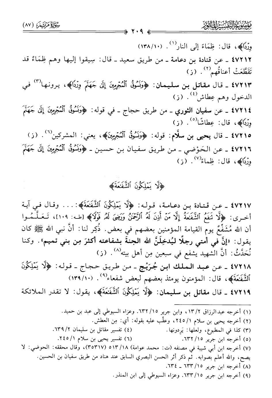 ٤٧٢١٨ - عن عبد الملك ابن جُرَيْج -من طريق حجاج- قوله: {لا يملكون الشفاعة}، قال: المؤمنون يومئذ بعضهم لبعض شفعاء (¬٩). (١٠/ ١٣٩)
