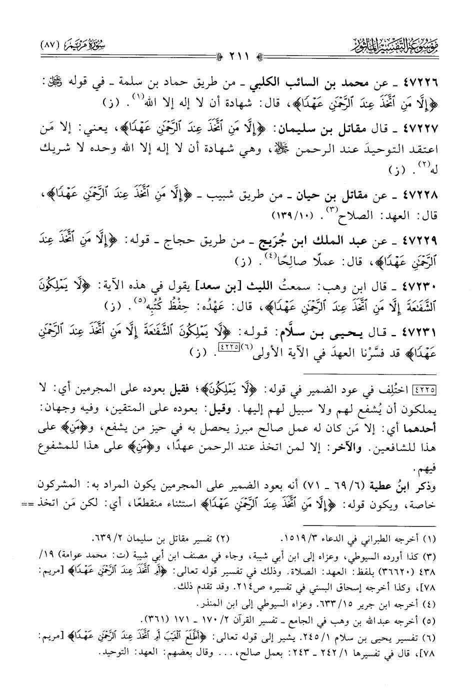 ٤٧٢٢٦ - عن محمد بن السائب الكلبي -من طريق حماد بن سلمة- في قوله - عز وجل -: {إلا من اتخذ عند الرحمن عهدًا}، قال: شهادة أن لا إله إلا الله (¬١). (ز)