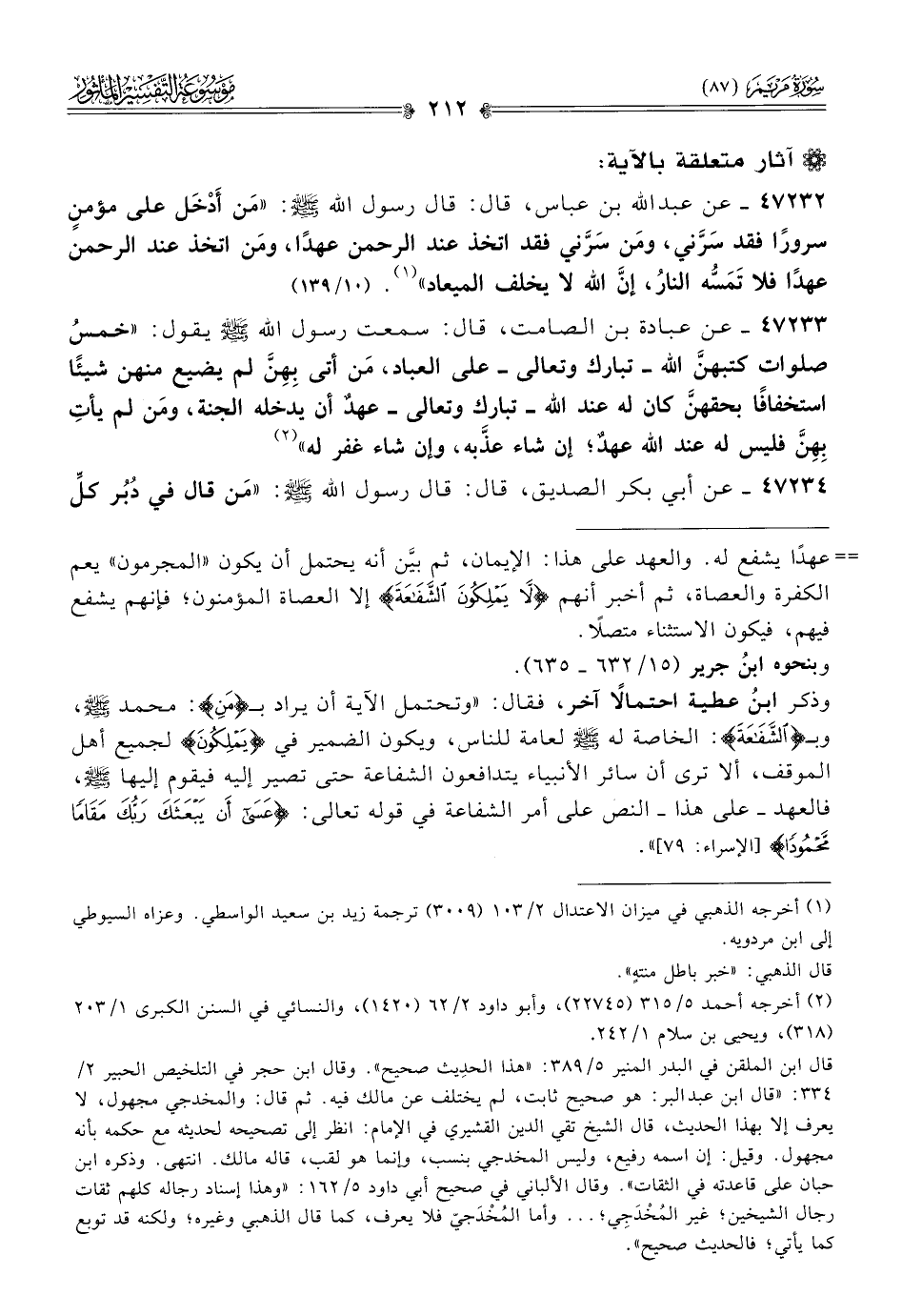 ٤٧٢٣٢ - عن عبد الله بن عباس، قال: قال رسول الله - صلى الله عليه وسلم -: «مَن أدْخَل على مؤمنٍ سرورًا فقد سَرَّني، ومَن سَرَّني فقد اتخذ عند الرحمن عهدًا، ومَن اتخذ عند الرحمن عهدًا فلا تَمَسُّه النارُ، إنّ الله لا يخلف الميعاد» (¬١). (١٠/ ١٣٩)