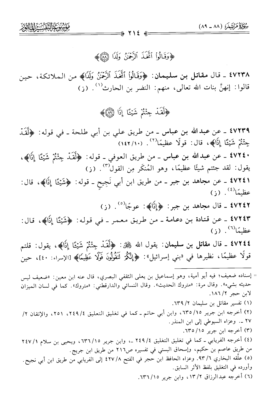 ٤٧٢٣٩ - عن عبد الله بن عباس -من طريق علي بن أبي طلحة- في قوله: {لقد جئتم شيئا إدا}، قال: قولًا عظيمًا (¬٢).