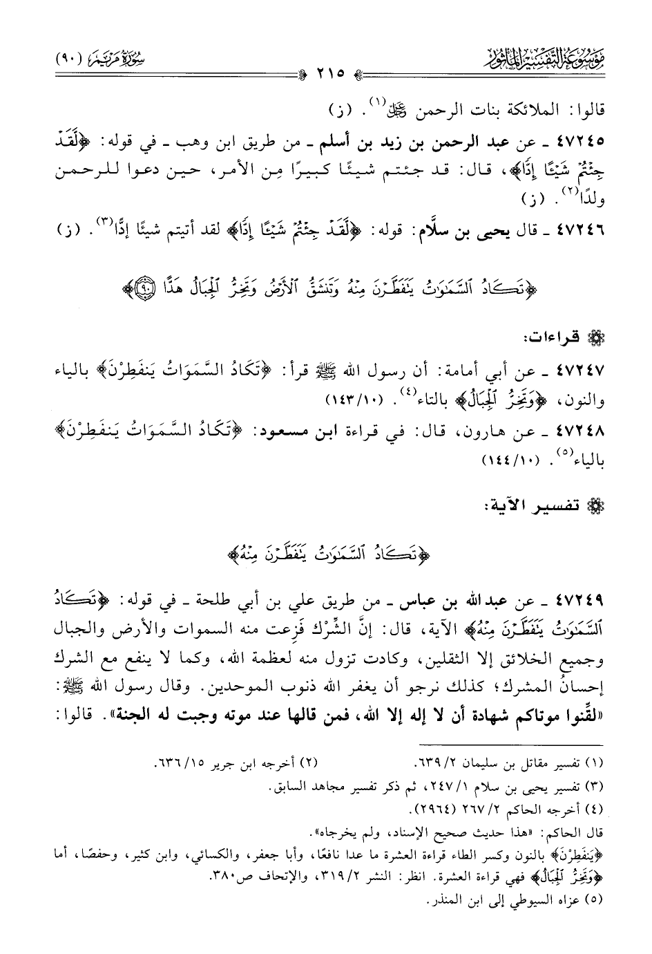 ٤٧٢٤٩ - عن عبد الله بن عباس -من طريق علي ابن أبي طلحة- في قوله: {تكاد السموات يتفطرن منه} الآية، قال: إنّ الشِّرْك فَزِعت منه السموات والأرض والجبال وجميع الخلائق إلا الثقلين، وكادت تزول منه لعظمة الله، وكما لا ينفع مع الشرك إحسانُ المشرك؛ كذلك نرجو أن يغفر الله ذنوب الموحدين. وقال رسول الله - صلى الله عليه وسلم -: «لقِّنوا موتاكم شهادة أن لا إله إلا الله، فمن قالها عند موته وجبت له الجنة». قالوا: