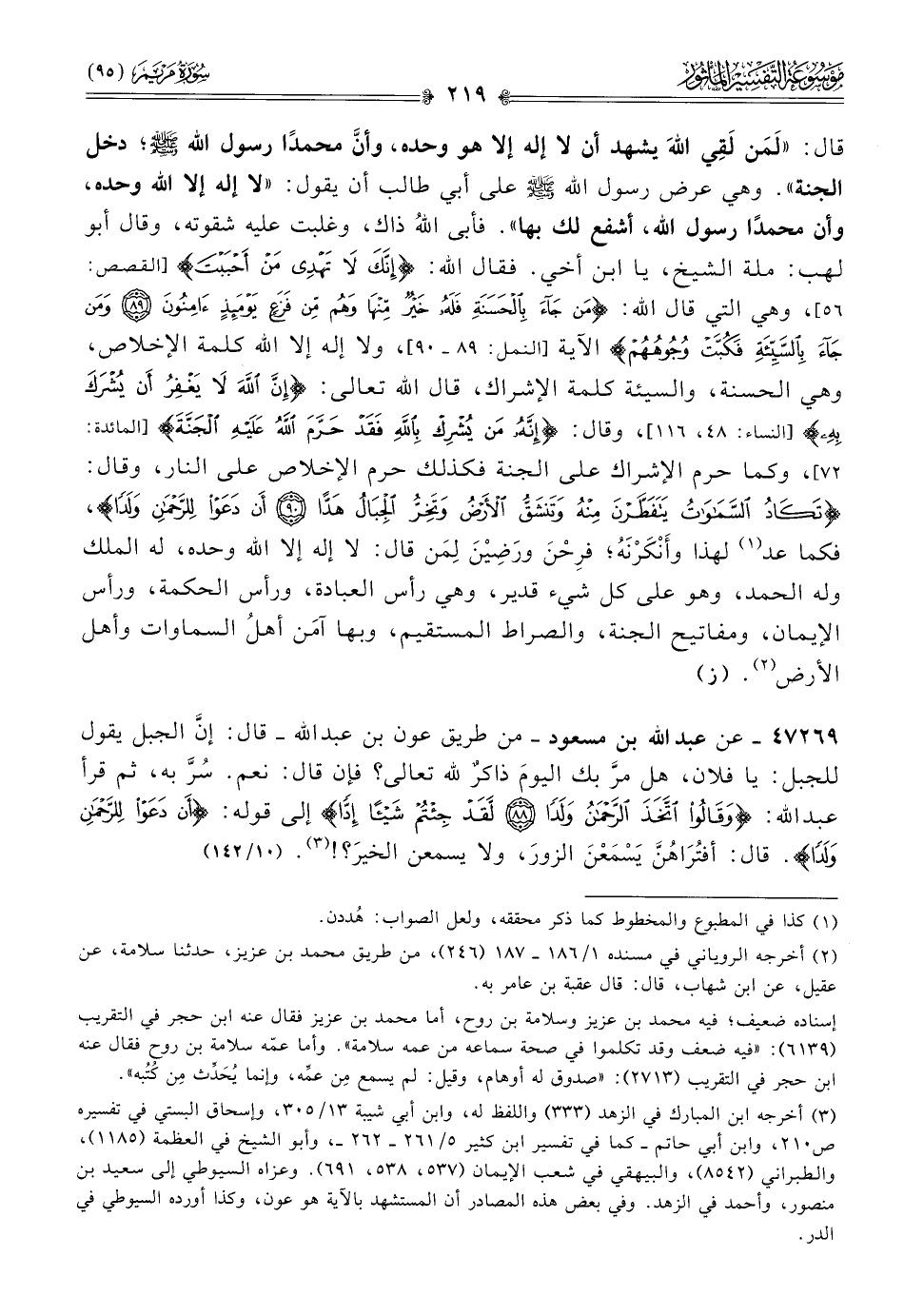٤٧٢٦٩ - عن عبد الله بن مسعود -من طريق عون بن عبد الله- قال: إنّ الجبل يقول للجبل: يا فلان، هل مرَّ بك اليومَ ذاكرٌ لله تعالى؟ فإن قال: نعم. سُرَّ به، ثم قرأ عبد الله: {وقالوا اتخذ الرحمن ولدا لقد جئتم شيئا إدا} إلى قوله: {أن دعوا للرحمن ولدا}. قال: أفتُراهُنَّ يَسْمَعْنَ الزورَ، ولا يسمعن الخيرَ؟! (¬٣). (١٠/ ١٤٢)