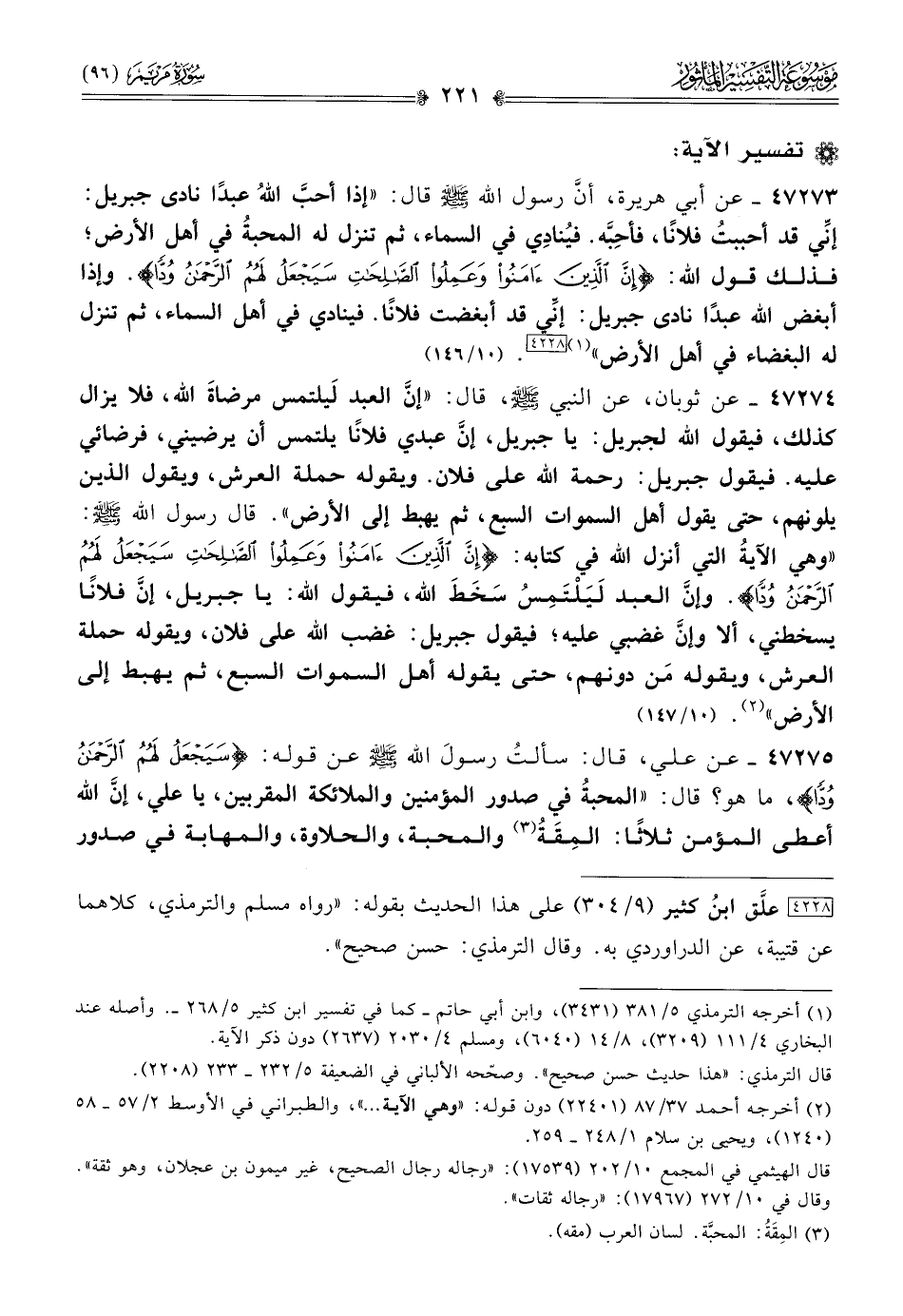 ٤٧٢٧٤ - عن ثوبان، عن النبي - صلى الله عليه وسلم -، قال: «إنّ العبد لَيلتمس مرضاةَ الله، فلا يزال كذلك، فيقول الله لجبريل: يا جبريل، إنّ عبدي فلانًا يلتمس أن يرضيني، فرضائي عليه. فيقول جبريل: رحمة الله على فلان. ويقوله حملة العرش، ويقول الذين يلونهم، حتى يقول أهل السموات السبع، ثم يهبط إلى الأرض». قال رسول الله - صلى الله عليه وسلم -: «وهي الآيةُ التي أنزل الله في كتابه: {إن الذين آمنوا وعملوا الصالحات سيجعل لهم الرحمن ودا}. وإنّ العبد لَيَلْتَمِسُ سَخَطَ الله، فيقول الله: يا جبريل، إنّ فلانًا يسخطني، ألا وإنّ غضبي عليه؛ فيقول جبريل: غضب الله على فلان، ويقوله حملة العرش، ويقوله مَن دونهم، حتى يقوله أهل السموات السبع، ثم يهبط إلى الأرض» (¬٢). (١٠/ ١٤٧)