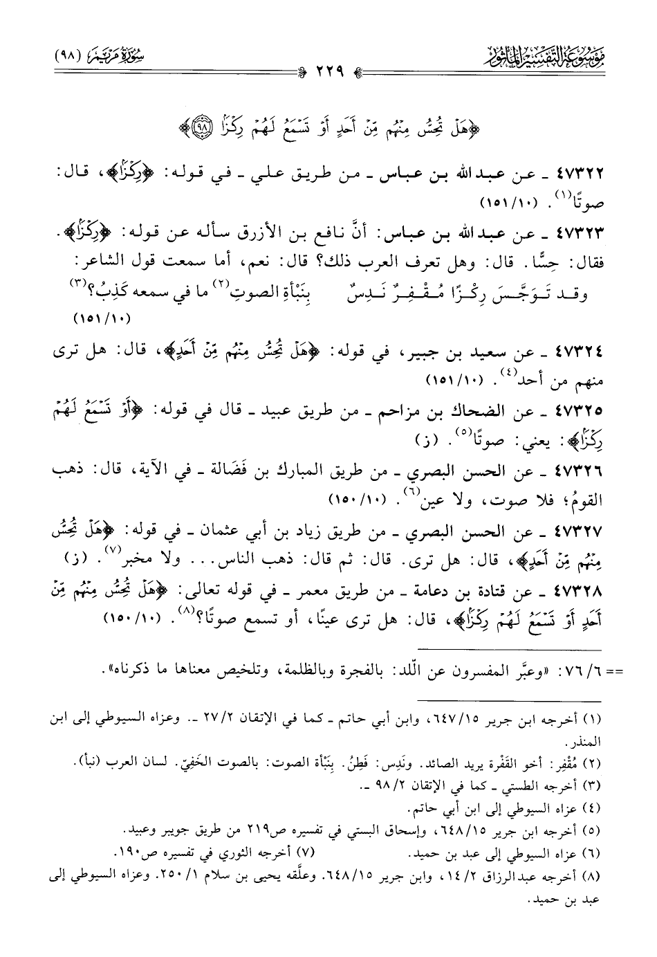 ٤٧٣٢٣ - عن عبد الله بن عباس: أنّ نافع بن الأزرق سأله عن قوله: {ركزا}. فقال: حِسًّا. قال: وهل تعرف العرب ذلك؟ قال: نعم، أما سمعت قول الشاعر: