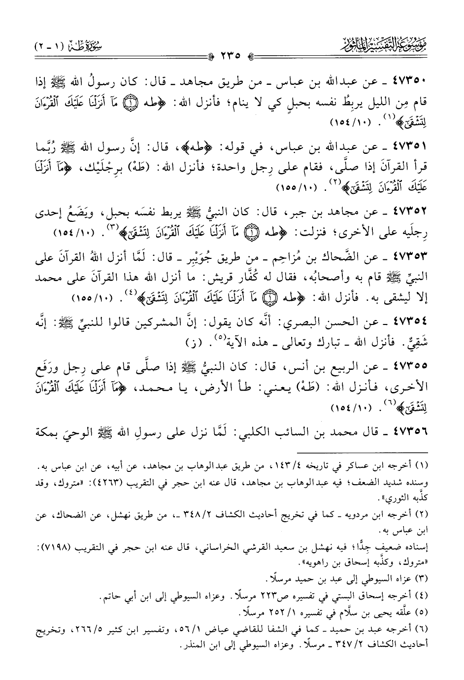 ٤٧٣٥٢ - عن مجاهد بن جبر، قال: كان النبيُّ - صلى الله عليه وسلم - يربط نفسَه بحبل، ويَضَعُ إحدى رِجلَيه على الأخرى؛ فنزلت: {طه ما أنزلنا عليك القرآن لتشقى} (¬٣). (١٠/ ١٥٤)
