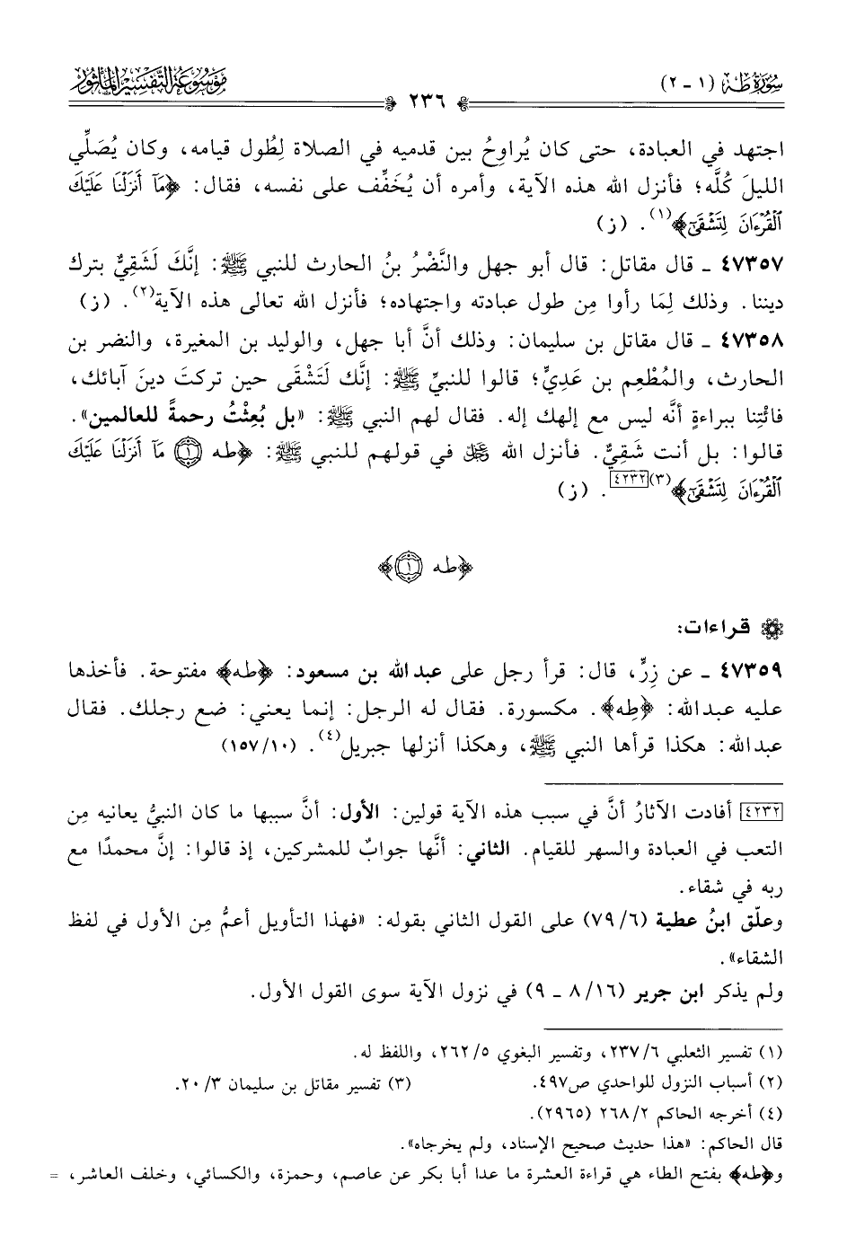 ٤٧٣٥٧ - قال مقاتل: قال أبو جهل والنَّضْرُ بنُ الحارث للنبي - صلى الله عليه وسلم -: إنّكَ لَشَقِيٌّ بترك ديننا. وذلك لِما رأوا مِن طول عبادته واجتهاده؛ فأنزل الله تعالى هذه الآية (¬٢). (ز)