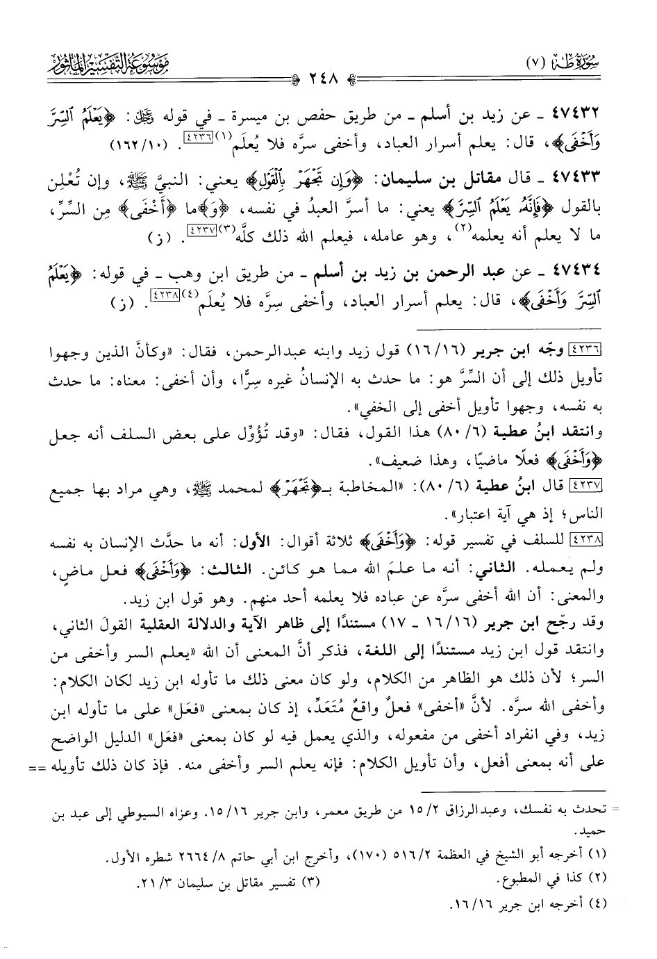 [٤٢٣٦] وجّه ابن جرير (١٦/ ١٦) قول زيد وابنه عبد الرحمن، فقال: «وكأنّ الذين وجهوا تأويل ذلك إلى أن السِّرَّ هو: ما حدث به الإنسانُ غيره سِرًّا، وأن أخفى: معناه: ما حدث به نفسه، وجهوا تأويل أخفى إلى الخفي».