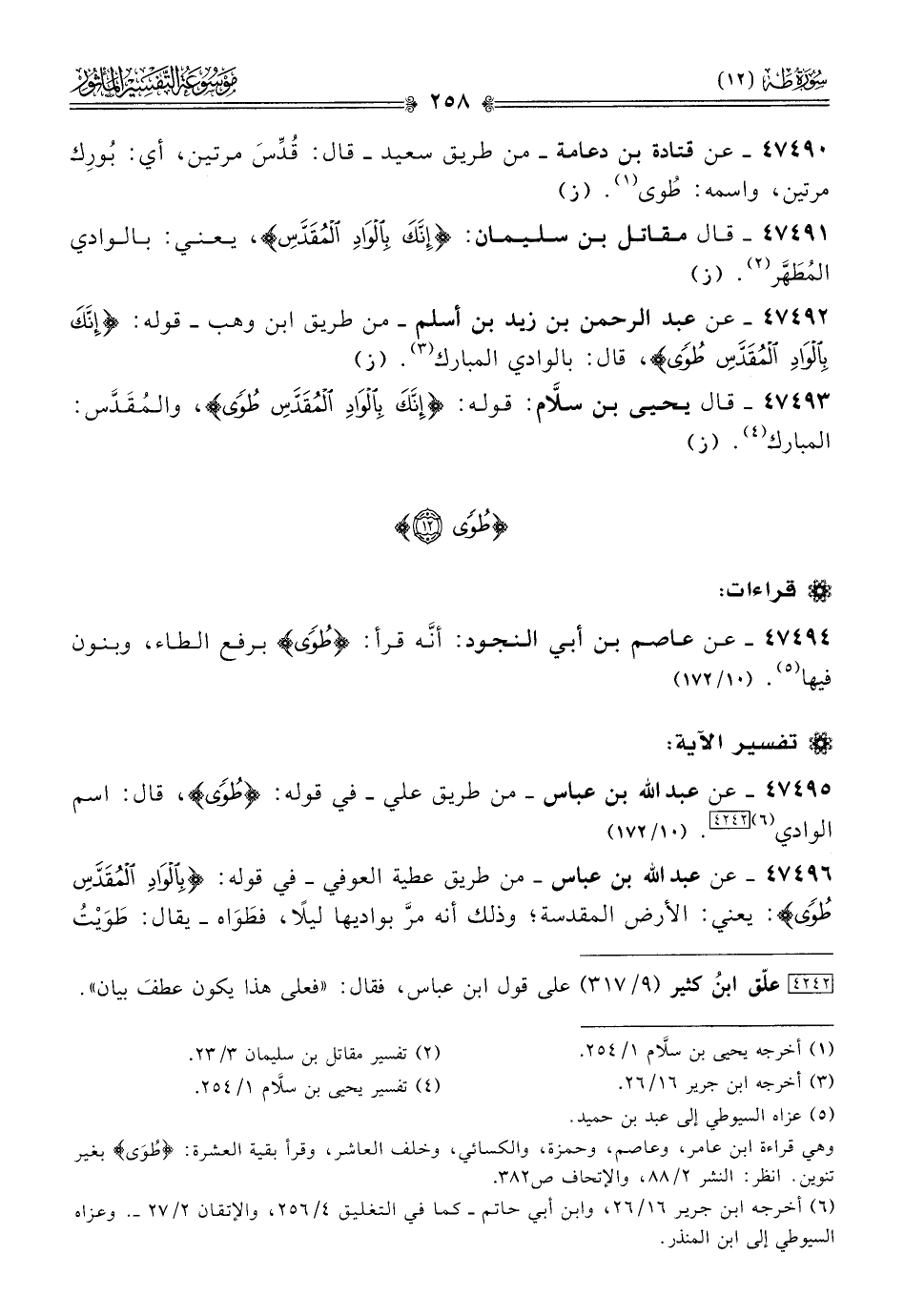 ٤٧٤٩٤ - عن عاصم بن أبي النجود أنّه قرأ: {طُوًى} برفع الطاء، وبنون فيها (¬٥). (١٠/ ١٧٢)