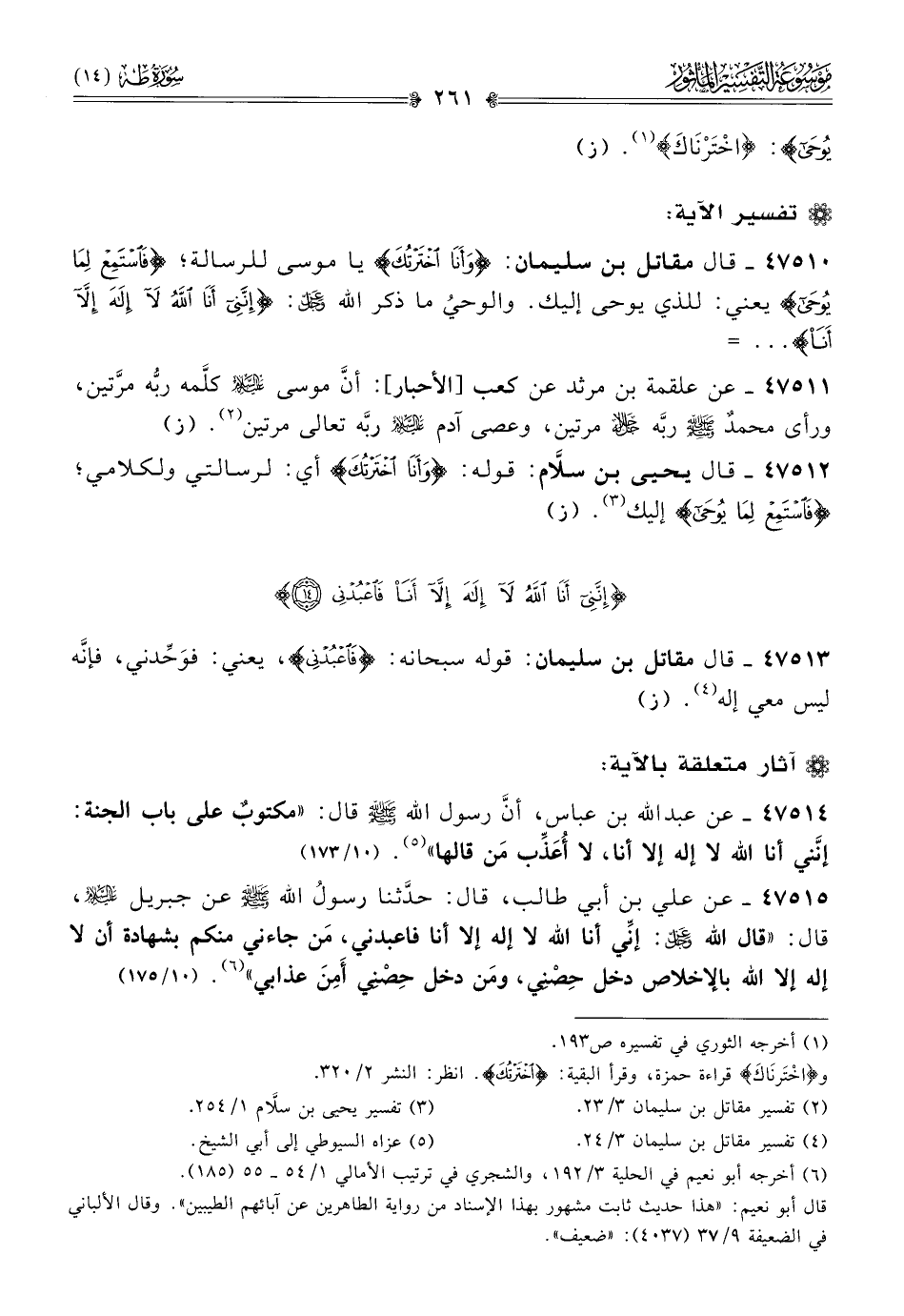 ٤٧٥١٠ - قال مقاتل بن سليمان: {وأنا اخترتك} يا موسى للرسالة؛ {فاستمع لما يوحى} يعني: للذي يوحى إليك. والوحيُ ما ذكر الله - عز وجل -: {إنني أنا الله لا إله إلا أنا} ... =