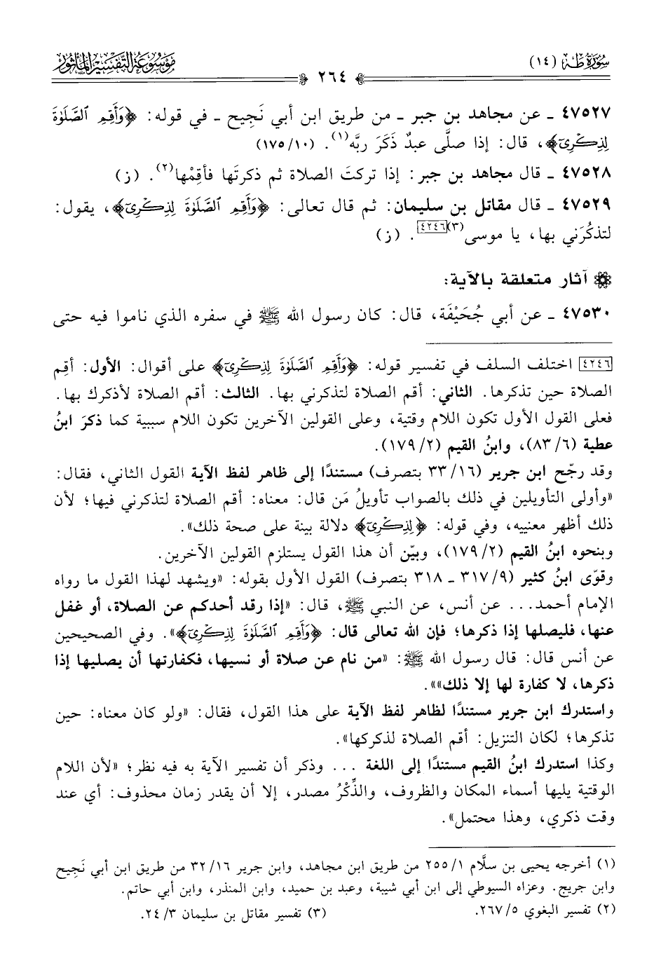 [٤٢٤٦] اختلف السلف في تفسير قوله: {وأقم الصلاة لذكري} على أقوال: الأول: أقِم الصلاة حين تذكرها. الثاني: أقم الصلاة لتذكرني بها. الثالث: أقم الصلاة لأذكرك بها. فعلى القول الأول تكون اللام وقتية، وعلى القولين الآخرين تكون اللام سببية كما ذكرَ ابنُ عطية (٦/ ٨٣)، وابنُ القيم (٢/ ١٧٩).