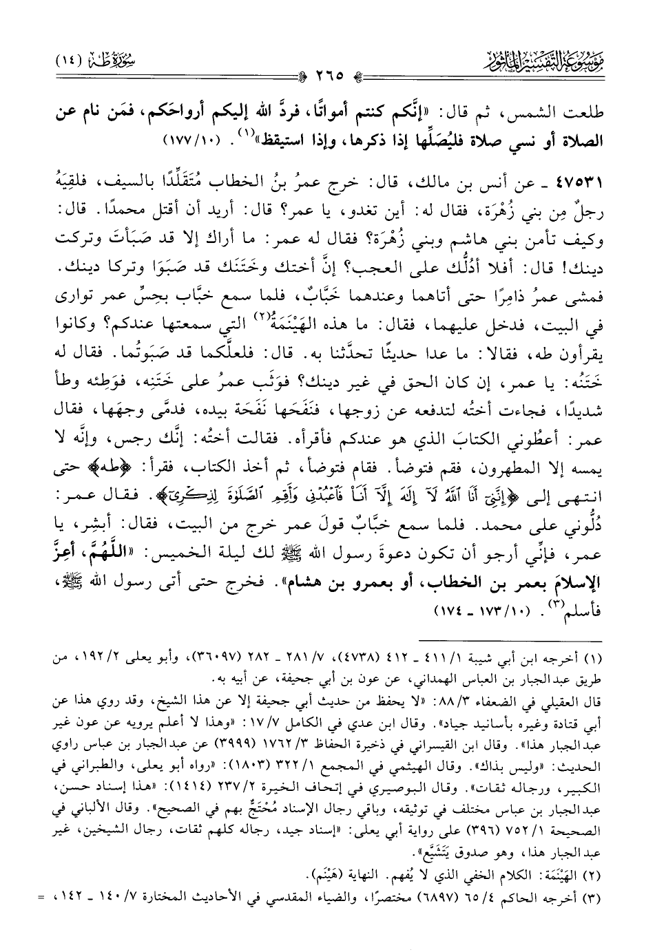 ٤٧٥٣١ - عن أنس بن مالك، قال: خرج عمرُ بنُ الخطاب مُتَقَلِّدًا بالسيف، فلقِيَهُ رجلٌ مِن بني زُهْرَة، فقال له: أين تغدو، يا عمر؟ قال: أريد أن أقتل محمدًا. قال: وكيف تأمن بني هاشم وبني زُهْرَة؟ فقال له عمر: ما أراك إلا قد صَبَأتَ وتركت دينك! قال: أفلا أدُلُّك على العجب؟ إنّ أختك وخَتَنَك قد صَبَوا وتركا دينك. فمشى عمرُ ذامِرًا حتى أتاهما وعندهما خَبّابٌ، فلما سمع خبّاب بحِسِّ عمر توارى في البيت، فدخل عليهما، فقال: ما هذه الهَيْنَمَةُ (¬٢) التي سمعتها عندكم؟ وكانوا يقرأون طه، فقالا: ما عدا حديثًا تحدَّثنا به. قال: فلعلَّكما قد صَبَوتُما. فقال له خَتَنُه: يا عمر، إن كان الحق في غير دينك؟ فوَثَب عمرُ على خَتَنِه، فوَطِئه وطأ شديدًا، فجاءت أختُه لتدفعه عن زوجها، فنَفَحَها نَفَحَة بيده، فدمّى وجهَها، فقال عمر: أعطُوني الكتابَ الذي هو عندكم فأقرأه. فقالت أختُه: إنّك رجس، وإنّه لا يمسه إلا المطهرون، فقم فتوضأ. فقام فتوضأ، ثم أخذ الكتاب، فقرأ: {طه} حتى انتهى إلى {إنني أنا الله لا إله إلا أنا فاعبدني وأقم الصلاة لذكري}. فقال عمر: دُلُّوني على محمد. فلما سمع خبّابٌ قولَ عمر خرج من البيت، فقال: أبشِر، يا عمر، فإنِّي أرجو أن تكون دعوةَ رسول الله - صلى الله عليه وسلم - لك ليلة الخميس: «اللَّهُمَّ، أعِزَّ الإسلامَ بعمر بن الخطاب، أو بعمرو بن هشام». فخرج حتى أتى رسول الله - صلى الله عليه وسلم -، فأسلم (¬٣). (١٠/ ١٧٣ - ١٧٤)