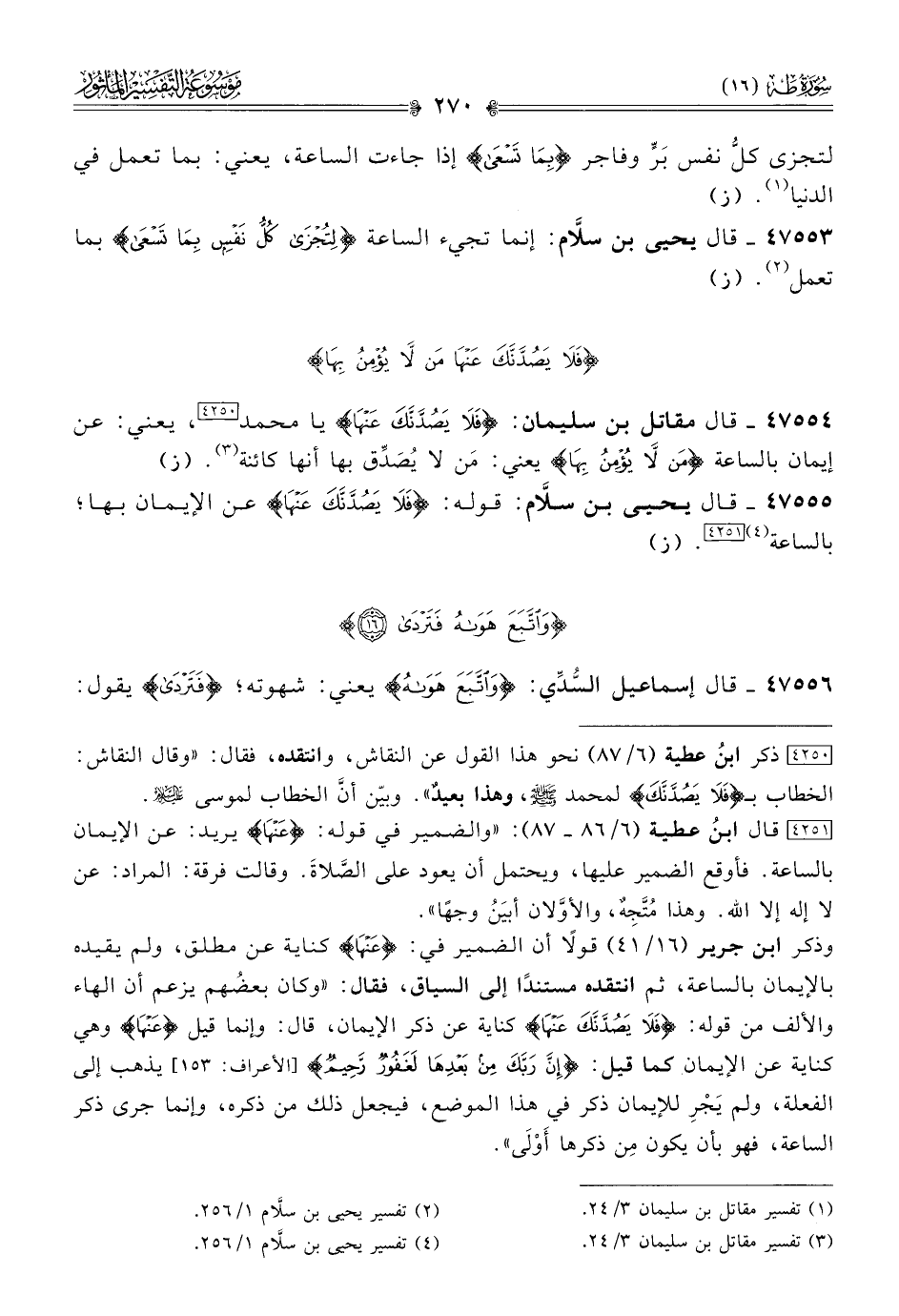 ٤٧٥٥٥ - قال يحيى بن سلّام: قوله: {فلا يصدنك عنها} عن الإيمان بها؛ بالساعة (¬٤) [٤٢٥١]. (ز)