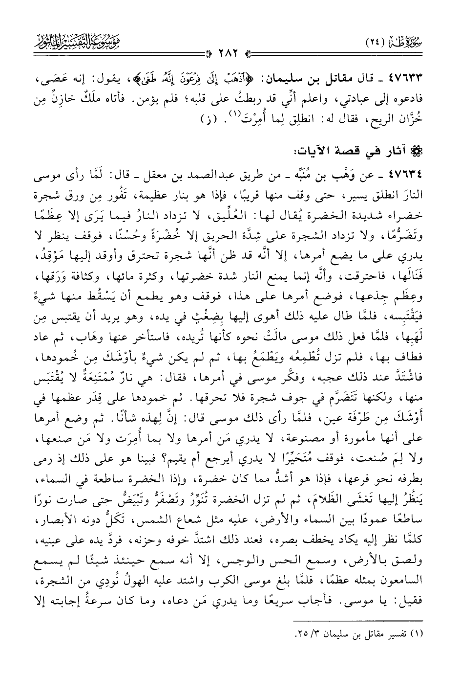 ٤٧٦٣٤ - عن وهْب بن مُنَبِّه -من طريق عبد الصمد بن معقل- قال: لَمّا رأى موسى النارَ انطلق يسير، حتى وقف منها قريبًا، فإذا هو بنار عظيمة، تَفُور مِن ورق شجرة خضراء شديدة الخضرة يُقال لها: العُلِّيق، لا تزداد النارُ فيما يَرى إلا عِظَمًا وتَضَرُّمًا، ولا تزداد الشجرة على شِدَّة الحريق إلا خُضْرَةً وحُسْنًا، فوقف ينظر لا يدري على ما يضع أمرها، إلا أنّه قد ظن أنّها شجرة تحترق وأوقد إليها مَوْقِدُ، فَنالَها، فاحترقت، وأنّه إنما يمنع النار شدة خضرتها، وكثرة مائها، وكثافة ورَقها، وعِظَم جِذعها، فوضع أمرها على هذا، فوقف وهو يطمع أن يَسْقُط منها شيءٌ فيَقْتَبِسه، فلمّا طال عليه ذلك أهوى إليها بِضِغْثٍ في يده، وهو يريد أن يقتبس مِن لَهَبِها، فلمّا فعل ذلك موسى مالَتْ نحوه كأنها تُريده، فاستأخر عنها وهاب، ثم عاد فطاف بها، فلم تزل تُطْمِعُه ويَطْمَعُ بها، ثم لم يكن شيءٌ بأوْشَكَ مِن خُمودها، فاشْتَدَّ عند ذلك عجبه، وفكَّر موسى في أمرها، فقال: هي نارٌ مُمْتَنِعَةٌ لا يُقْتَبَس منها، ولكنها تَتَضَرَّم في جوف شجرة فلا تحرقها. ثم خمودها على قِدَر عظمها في أوْشَكَ مِن طَرْفَة عين، فلمّا رأى ذلك موسى قال: إنّ لِهذه شأنًا. ثم وضع أمرها على أنها مأمورة أو مصنوعة، لا يدري مَن أمرها ولا بما أُمِرَت ولا مَن صنعها، ولا لِمَ صُنعت، فوقف مُتَحَيِّرًا لا يدري أيرجع أم يقيم؟ فبينا هو على ذلك إذ رمى بطرفه نحو فرعها، فإذا هو أشدُّ مما كان خضرة، وإذا الخضرة ساطعة في السماء، يَنظُرُ إليها تَغشى الظَلامَ، ثم لم تزل الخضرة تُنَوِّرُ وتَصْفَرُّ وتَبْيَضُّ حتى صارت نورًا ساطعًا عمودًا بين السماء والأرض، عليه مثل شعاع الشمس، تَكَلُّ دونه الأبصار، كلمّا نظر إليه يكاد يخطف بصره، فعند ذلك اشتدَّ خوفه وحزنه، فردَّ يده على عينيه، ولصق بالأرض، وسمع الحس والوجس، إلا أنه سمع حينئذ شيئًا لم يسمع السامعون بمثله عظمًا، فلمّا بلغ موسى الكرب واشتد عليه الهولُ نُودِي من الشجرة، فقيل: يا موسى. فأجاب سريعًا وما يدري مَن دعاه، وما كان سرعةُ إجابته إلا