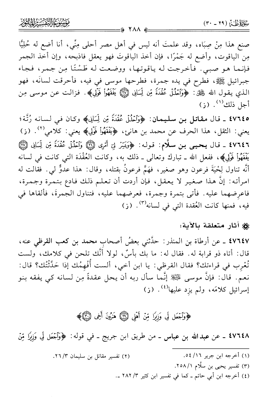 ٤٧٦٤٥ - قال مقاتل بن سليمان: {واحلل عقدة من لساني} وكان في لسانه رُتَّة؛ يعني: الثقل، هذا الحرف عن محمد بن هانئ، {يفقهوا قولي} يعني: كلامي (¬٢). (ز)