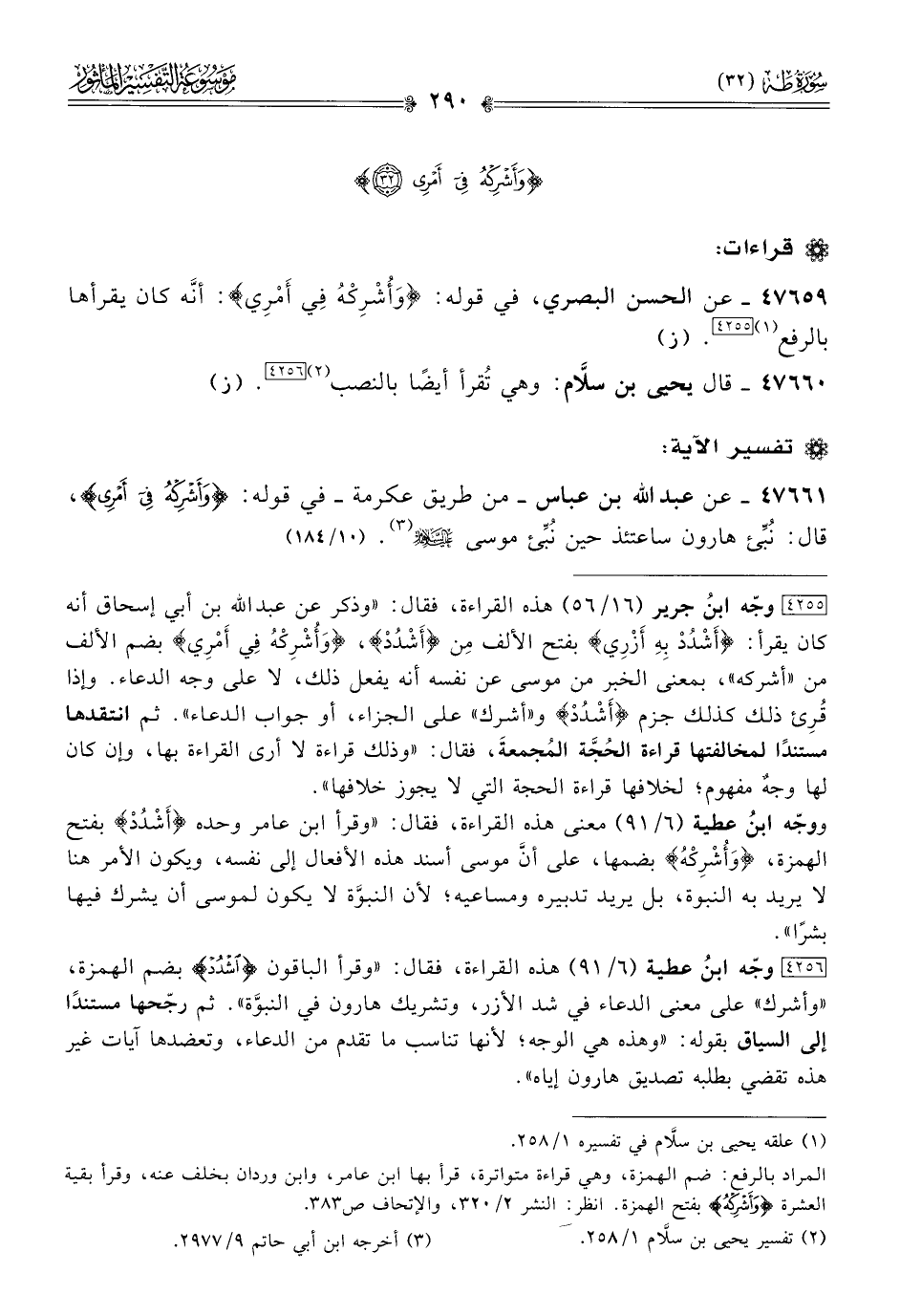 [٤٢٥٥] وجّه ابنُ جرير (١٦/ ٥٦) هذه القراءة، فقال: «وذكر عن عبد الله بن أبي إسحاق أنه كان يقرأ: «أشْدُدْ بِهِ أزْرِي» بفتح الألف مِن «أشْدُدْ»، «وأُشْرِكْهُ فِي أمْرِي» بضم الألف من» أشركه «، بمعنى الخبر من موسى عن نفسه أنه يفعل ذلك، لا على وجه الدعاء. وإذا قُرِئ ذلك كذلك جزم «أشْدُدْ» و» أشرك «على الجزاء، أو جواب الدعاء». ثم انتقدها مستندًا لمخالفتها قراءة الحُجَّة المُجمعةَ، فقال: «وذلك قراءة لا أرى القراءة بها، وإن كان لها وجهٌ مفهوم؛ لخلافها قراءة الحجة التي لا يجوز خلافها».