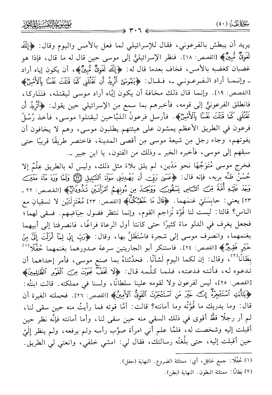 يريد أن يبطش بالفرعوني، فقال للإسرائيلي لما فعل بالأمس واليوم وقال: {إنك لغوي مبين} [القصص: ١٨]. فنظر الإسرائيليُّ إلى موسى حين قال له ما قال، فإذا هو غضبان كغضبه بالأمس، فخاف بعدما قال له: {إنك لغوي مبين}، أن يكون إياه أراد -وإنما أراد الفرعوني-، فقال: {يا موسى أتريد أن تقتلني كما قتلت نفسا بالأمس} [القصص: ١٩]. وإنما قال ذلك مخافة أن يكون إيّاه أراد موسى ليقتله، فتَتاركا، فانطلق الفرعونيُّ إلى قومه، فأخبرهم بما سمع مِن الإسرائيلي حين يقول: {أتريد أن تقتلني كما قتلت نفسا بالأمس}. فأرسل فرعونُ الذبّاحين ليقتلوا موسى، فأخذ رُسُلُ فرعون في الطريق الأعظم يمشون على هيئتهم يطلبون موسى، وهم لا يخافون أن يفوتهم، وجاء رجل مِن شيعة موسى مِن أقصى المدينة، فاختصر طريقًا قريبًا حتى سبقهم إلى موسى، فأخبره الخبر -وذلك من الفتون، يا ابن جبير-.