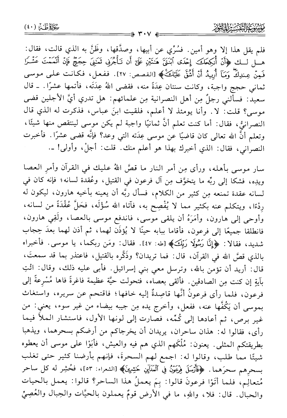 فلم يقل هذا إلا وهو أمين. فسُرِّي عن أبيها، وصدَّقها، وظَنَّ به الذي قالت، فقال: هل لك {أن أنكحك إحدى ابنتي هاتين على أن تأجرني ثماني حجج فإن أتممت عشرا فمن عندك وما أريد أن أشق عليك} [القصص: ٢٧]. ففعل، فكانت على موسى ثماني حجج واجبة، وكانت سنتان عِدَةً منه، فقضى اللهُ عِدَتَه، فأتمها عشرًا. -قال سعيد: فسألني رجلٌ مِن أهل النصرانية مِن علمائهم: هل تدري أيَّ الأجلين قضى موسى؟ قلت: لا. وأنا يومئذ لا أعلم، فلقيت ابنَ عباس، فذكرت له الذي قال النصرانيُّ، فقال: أما كنت تعلم أنّ ثمانيًا واجبة لم يكن موسى لينتقص منها شيئًا، وتعلم أنّ الله تعالى كان قاضيًا عن موسى عِدَته التي وعد؟ فإنّه قضى عشرًا. فأخبرت النصراني، فقال: الذي أخبرك بهذا هو أعلم منك. قلت: أجلْ، وأولى! -.