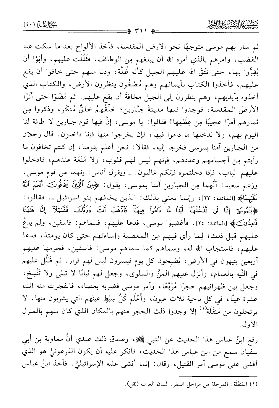 ثم سار بهم موسى متوجهًا نحو الأرض المقدسة، فأخذ الألواح بعد ما سكت عنه الغضب، وأمرهم بالذي أمره الله أن يبلغهم مِن الوظائف، فثَقُلَت عليهم، وأبَوْا أن يُقِرُّوا بها، حتى نَتَقَ الله عليهم الجبل كأنه ظُلَّة، ودنا منهم حتى خافوا أن يقع عليهم، فأخذوا الكتاب بأيمانهم وهم مُصْغُون ينظرون الأرض، والكتاب الذي أخذوه بأيديهم، وهم ينظرون إلى الجبل مخافةَ أن يقع عليهم. ثم مَضَوْا حتى أتَوُا الأرضَ المقدسة، فوجدوا فيها مدينةَ جبّارين؛ خَلْقُهمُ خلقٌ مُنكَر، وذكروا مِن ثمارهم أمرًا عجيبًا مِن عِظَمِها! فقالوا: يا موسى، إنّ فيها قوم جبارين لا طاقة لنا اليوم بهم، ولا ندخلها ما داموا فيها، فإن يخرجوا منها فإنا داخلون. قال رجلان من الجبارين آمنا بموسى فخرجا إليه، فقالا: نحن أعلم بقومنا، إن كنتم تخافون ما رأيتم مِن أجسامهم وعددهم، فإنهم ليس لهم قلوب، ولا مَنَعَة عندهم، فادخلوا عليهم الباب، فإذا دخلتموه فإنكم غالبون. -ويقول أناس: إنهما من قوم موسى، وزعم سعيد: أنّهما مِن الجبارين آمنا بموسى، يقول: {من الذين يخافون أنعم الله عليهما} [المائدة: ٣٣]، وإنما يعني بذلك: الذين يخافهم بنو إسرائيل-. فقالوا: {يا موسى إنا لن ندخلها أبدا ما داموا فيها فاذهب أنت وربك فقاتلا إنا ههنا قاعدون} [المائدة: ٢٤]. فأغضبوا موسى، فدعا عليهم، فسماهم: فاسقين، ولم يدعُ عليهم قبل ذلك؛ لِما رأى فيهم مِن المعصية وإساءتهم حتى كان يومئذ، فدعا عليهم، فاستجاب الله له، وسماهم كما سماهم موسى: فاسقين، فحرمها عليهم أربعين يتيهون في الأرض، يُصْبِحون كل يوم فيسيرون ليس لهم قرار. ثم ظَلَّل عليهم في التِّيه بالغمام، وأنزل عليهم المنَّ والسلوى، وجعل لهم ثيابًا لا تبلى ولا تَتَّسِخ، وجعل بين ظهرانيهم حجرًا مُرَبَّعًا، وأمر موسى فضربه بعصاه، فانفجرت منه اثنتا عشرة عينًا، في كل ناحية ثلاث عيون، وأَعْلَم كُلَّ سِبْطٍ عينَهم التي يشربون منها، لا يرتحلون من مَنقَلَة (¬١) إلا وجدوا ذلك الحجر منهم بالمكان الذي كان منهم بالمنزل الأول.