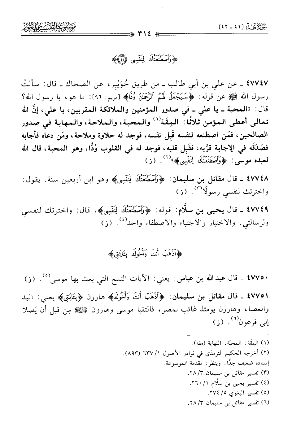 ٤٧٧٤٨ - قال مقاتل بن سليمان: {واصطنعتك لنفسي} وهو ابن أربعين سنة. يقول: واخترتك لنفسي رسولًا (¬٣). (ز)
