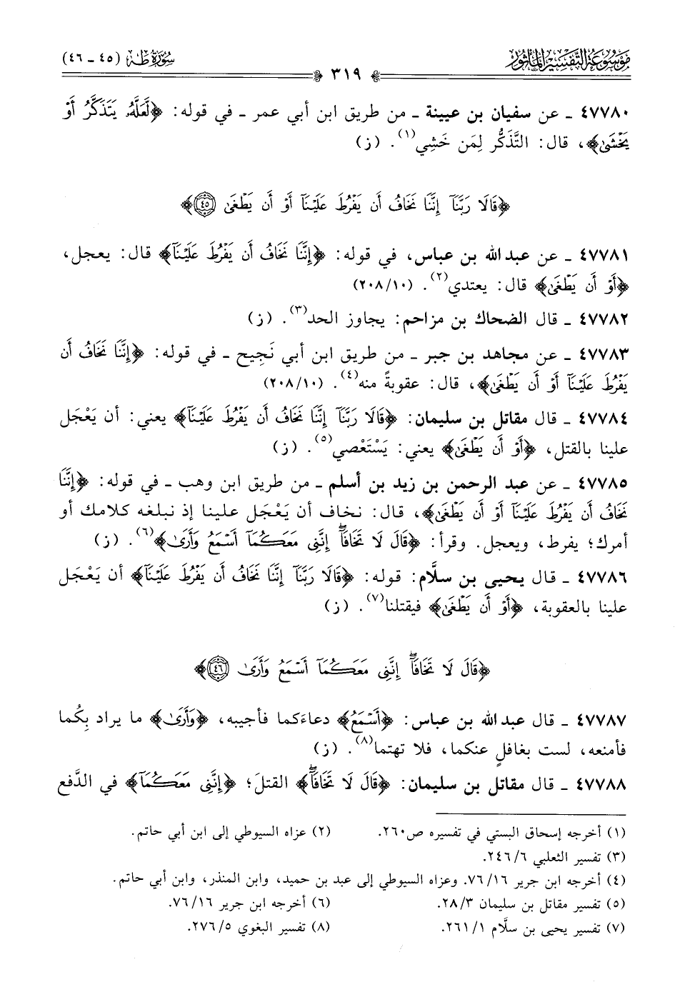 ٤٧٧٨٥ - عن عبد الرحمن بن زيد بن أسلم -من طريق ابن وهب- في قوله: {إننا نخاف أن يفرط علينا أو أن يطغى}، قال: نخاف أن يَعْجَل علينا إذ نبلغه كلامك أو أمرك؛ يفرط، ويعجل. وقرأ: {قال لا تخافا إنني معكما أسمع وأرى} (¬٦). (ز)