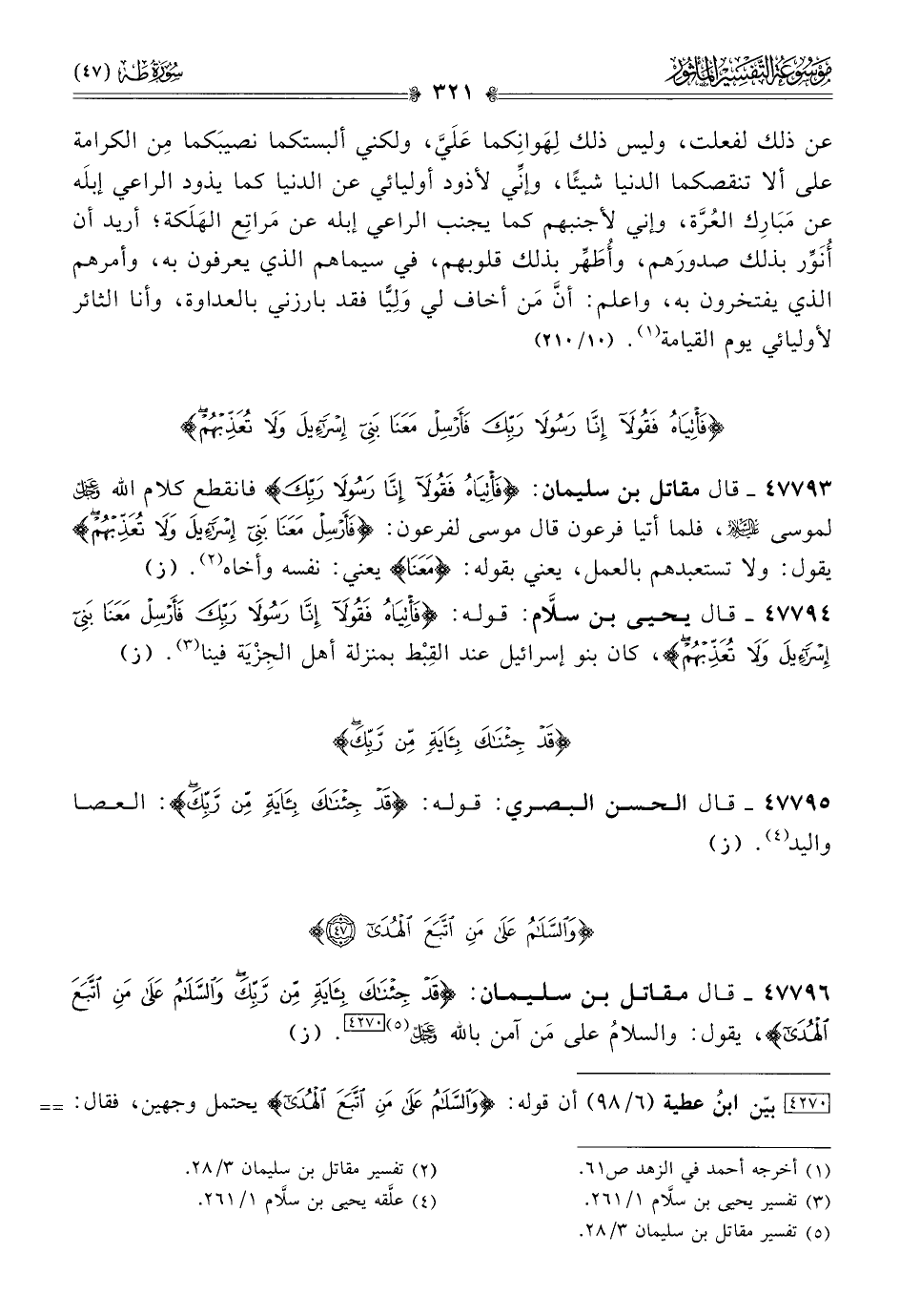 ٤٧٧٩٤ - قال يحيى بن سلّام: قوله: {فأتياه فقولا إنا رسولا ربك فأرسل معنا بني إسرائيل ولا تعذبهم}، كان بنو إسرائيل عند القِبْط بمنزلة أهل الجِزْيَة فينا (¬٣). (ز)