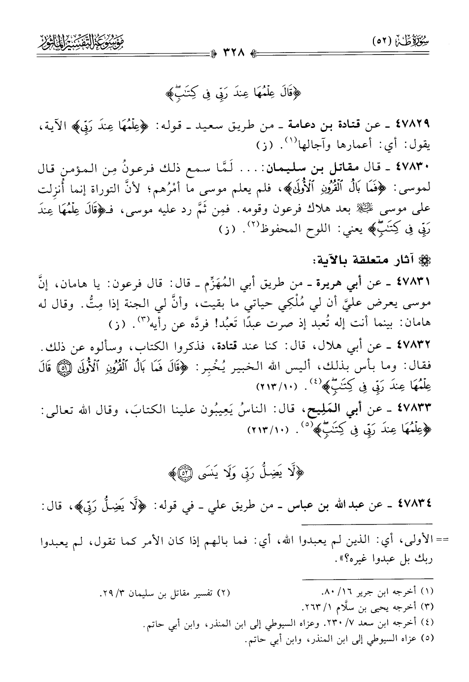 ٤٧٨٣٠ - قال مقاتل بن سليمان: ... لَمّا سمع ذلك فرعونُ مِن المؤمن قال لموسى: {فما بال القرون الأولى}، فلم يعلم موسى ما أمْرُهم؛ لأنّ التوراة إنما أُنزِلت على موسى - عليه السلام - بعد هلاك فرعون وقومه. فمِن ثَمَّ رد عليه موسى، فـ {قال علمها عند ربي في كتاب} يعني: اللوح المحفوظ (¬٢). (ز)