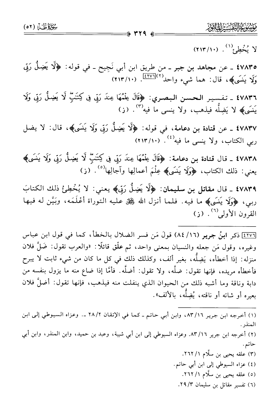 ٤٧٨٣٧ - عن قتادة بن دعامة، في قوله: {لا يضل ربي ولا ينسى}، قال: لا يضل ربي الكتاب، ولا ينسى ما فيه (¬٤). (١٠/ ٢١٣)