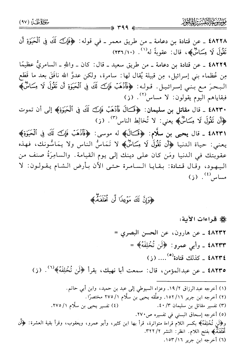 ٤٨٢٢٨ - عن قتادة بن دعامة -من طريق معمر- في قوله: {فإن لك في الحياة أن تقول لا مساس}، قال: عقوبةً له (¬١).