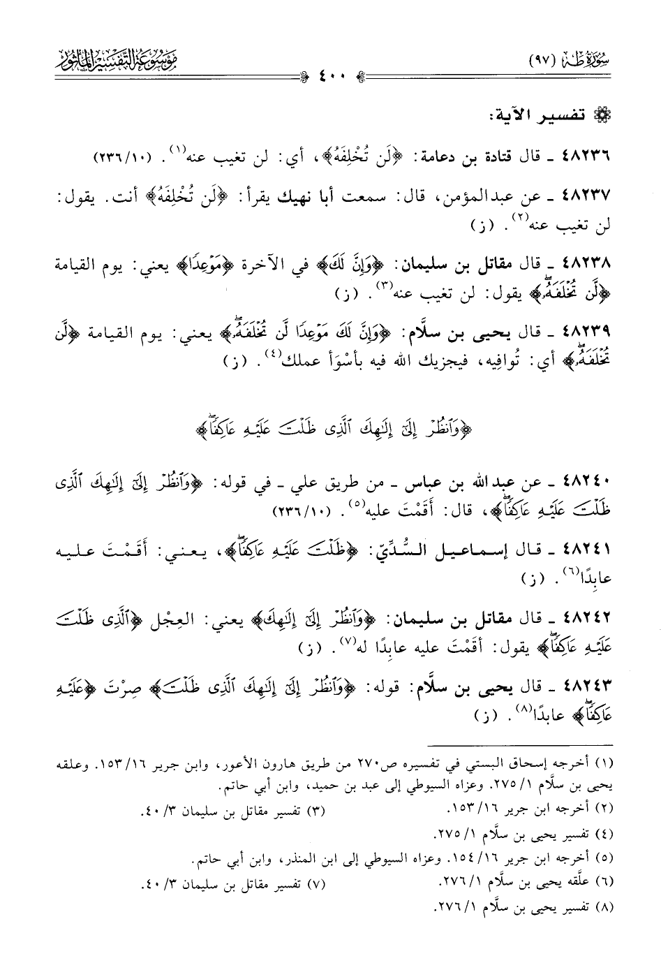 ٤٨٢٣٦ - قال قتادة بن دعامة: «لَن تُخْلِفَهُ»، أي: لن تغيب عنه (¬١). (١٠/ ٢٣٦)