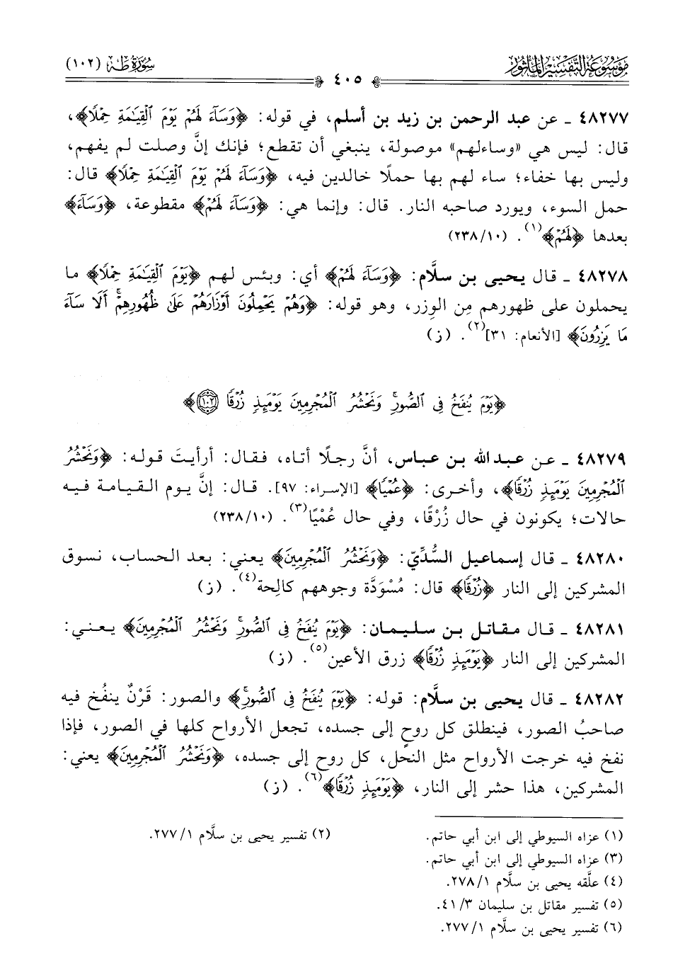 ٤٨٢٨٢ - قال يحيى بن سلّام: قوله: {يوم ينفخ في الصور} والصور: قَرْنٌ ينفُخ فيه صاحبُ الصور، فينطلق كل روحٍ إلى جسده، تجعل الأرواح كلها في الصور، فإذا نفخ فيه خرجت الأرواح مثل النحل، كل روح إلى جسده، {ونحشر المجرمين} يعني: المشركين، هذا حشر إلى النار، {يومئذ زرقا} (¬٦). (ز)